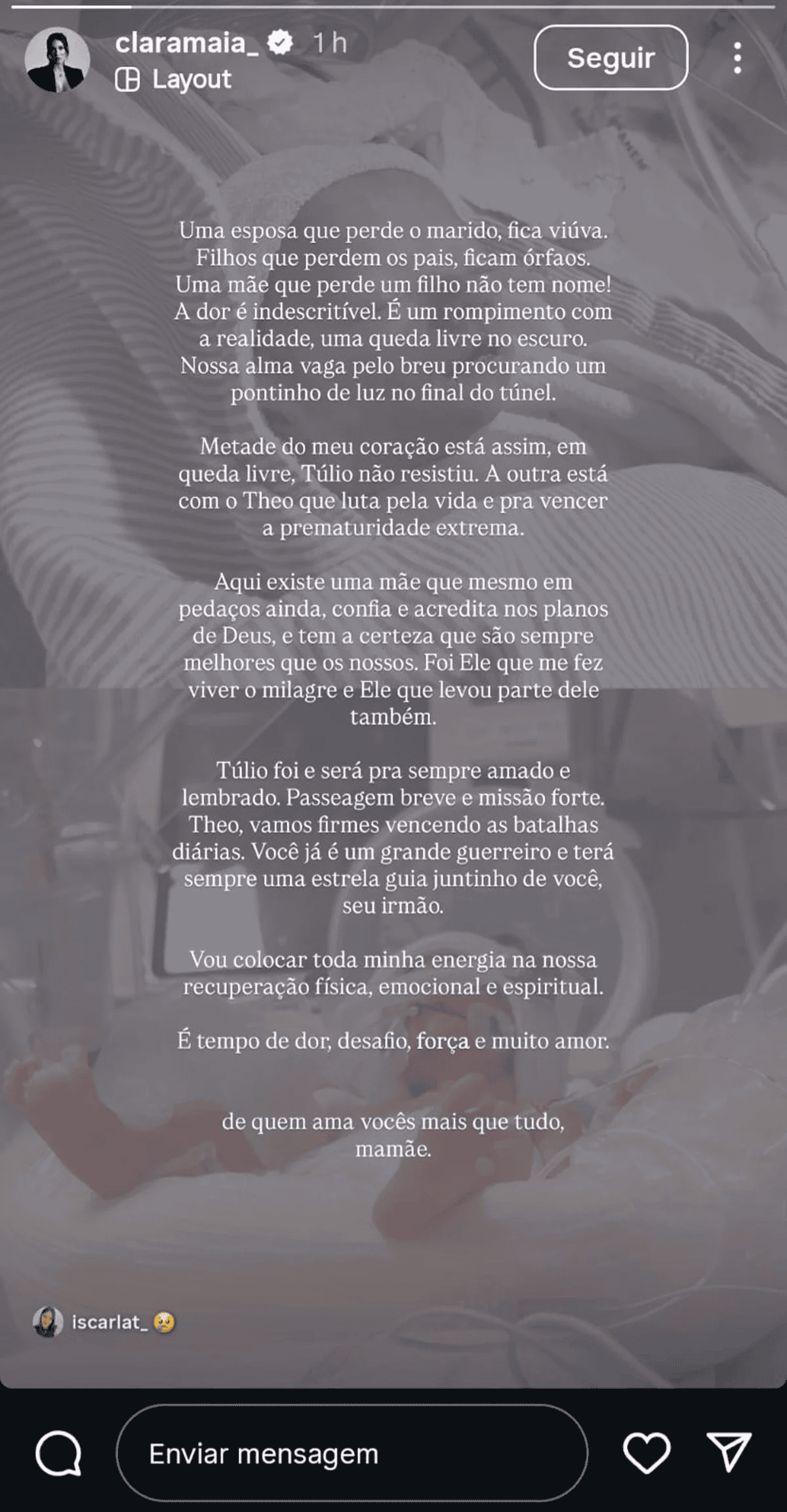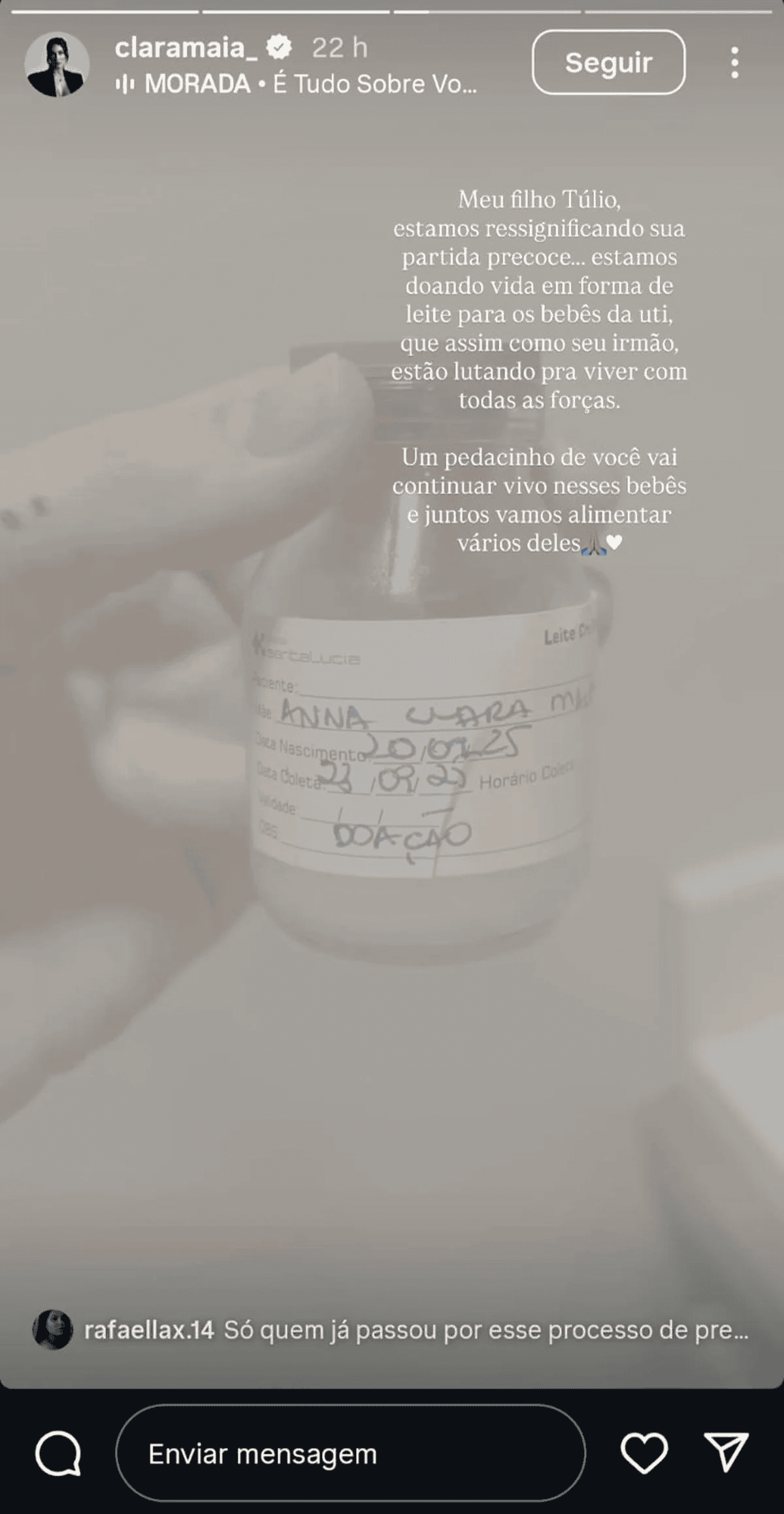 Clara também fez questão de agradecer ao marido, André Coelho, pelo apoio durante todo o processo. O casal, que já é pai dos gêmeos José e João, de 1 ano, enfrenta mais uma vez a experiência delicada da UTI neonatal. Além de acompanhar o filho, Clara tem doado leite materno para outros bebês internados, gesto que ela compartilhou com seus seguidores como forma de transformar a dor em solidariedade.