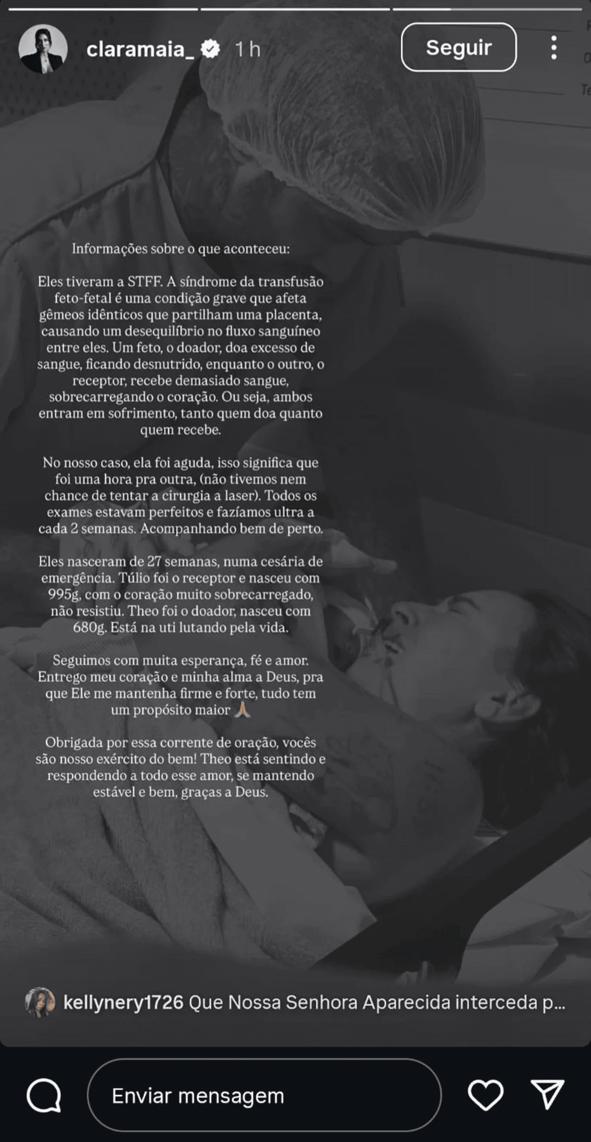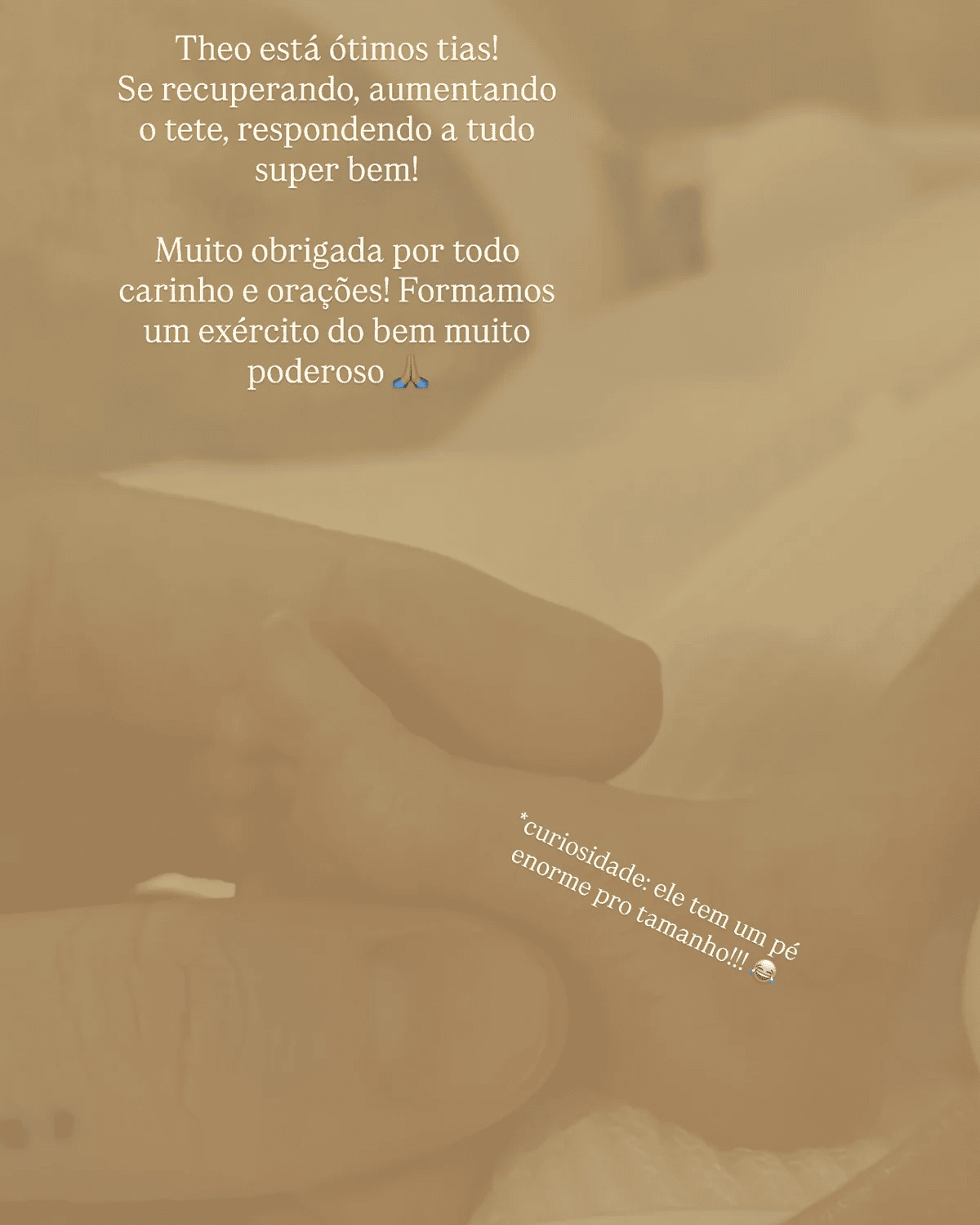A influenciadora compartilhou ainda um vídeo inédito do parto, ocorrido em 20 de setembro, descrevendo o dia como o mais difícil de sua vida, mas também como um momento de milagre e fé. Os gêmeos foram diagnosticados com a síndrome da transfusão feto-fetal (STFF), uma condição grave que afeta gêmeos idênticos que compartilham a mesma placenta. A doença causou um desequilíbrio no fluxo sanguíneo entre os fetos: Túlio, o receptor, teve o coração sobrecarregado e não resistiu; já Theo, o doador, nasceu com apenas 680g, mas segue lutando pela vida.
