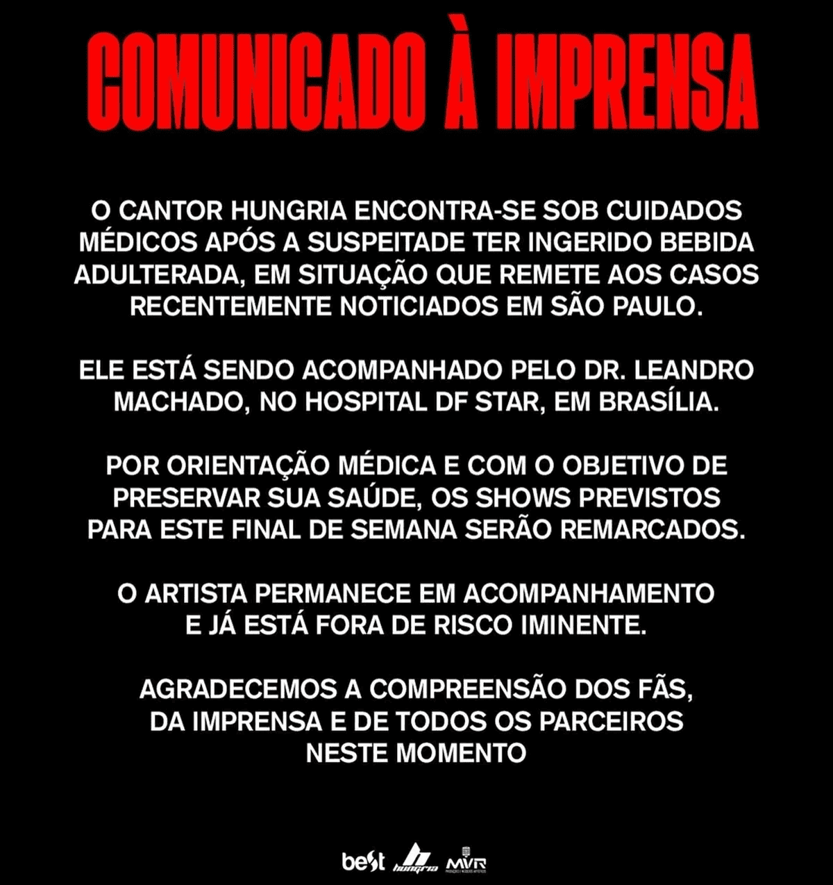 Até o momento, o estado de saúde de Hungria é considerado estável, mas inspira cuidados. Seus shows foram adiados e ele segue sob observação médica intensiva.