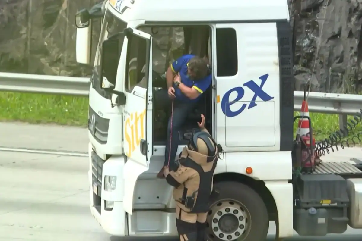 Na manhã desta quarta-feira (12/11), um motorista de caminhão desmaiou ao ser libertado por um agente do Grupo de Ações Táticas Especiais (Gate), após ter sido mantido refém por horas no Rodoanel, na Região Metropolitana de São Paulo. A vítima estava amarrada dentro da cabine do veículo a um objeto que parecia ser uma bomba, o que foi confirmado depois pela Polícia Militar como sendo um simulacro de explosivo.