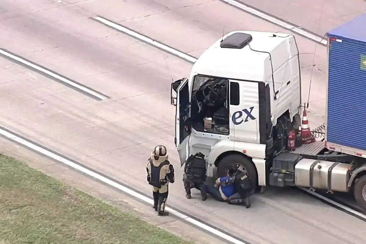 Três suspeitos fugiram após forçarem o motorista a posicionar o caminhão atravessado na pista, em Itapecerica da Serra, segundo informações da Artesp (Agência de Transporte do Estado de São Paulo). O caso foi classificado como de alta criticidade. A vítima permaneceu por cerca de quatro horas consciente, porém desorientada, envolta por fios do artefato falso.