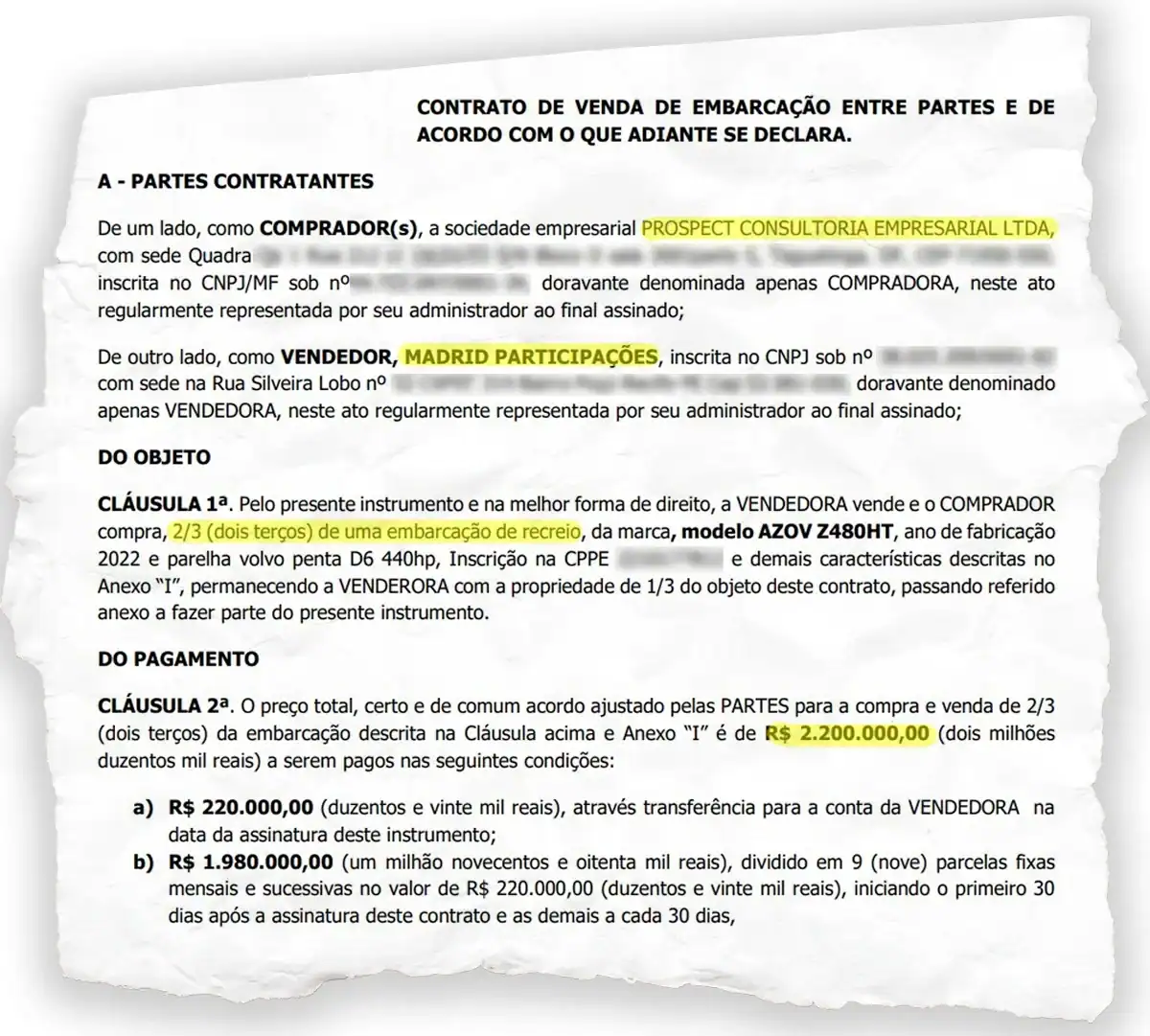 Inicialmente, Antonio adquiriu dois terços da lancha por R$ 2,2 milhões, parcelados em dez vezes. Em janeiro deste ano, ele firmou um aditivo contratual para comprar o terço restante, pagando mais R$ 1,2 milhão em três parcelas via Pix. A última transferência foi realizada em 10 de abril, pouco antes da deflagração da Operação Sem Desconto.
