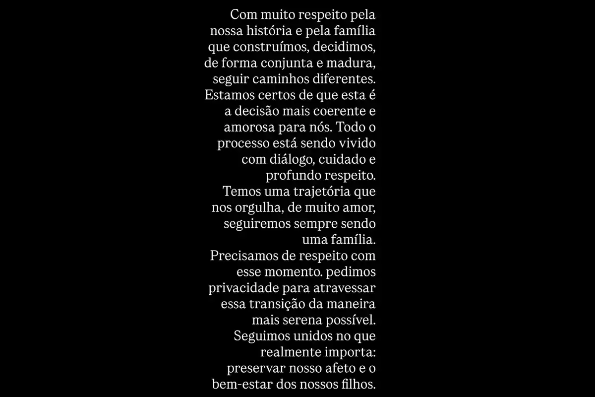Eles também pediram compreensão e privacidade durante esse período de transição, reforçando que continuarão unidos no cuidado e bem-estar dos filhos. A nota destacou ainda que todo o processo está sendo conduzido com diálogo e respeito.