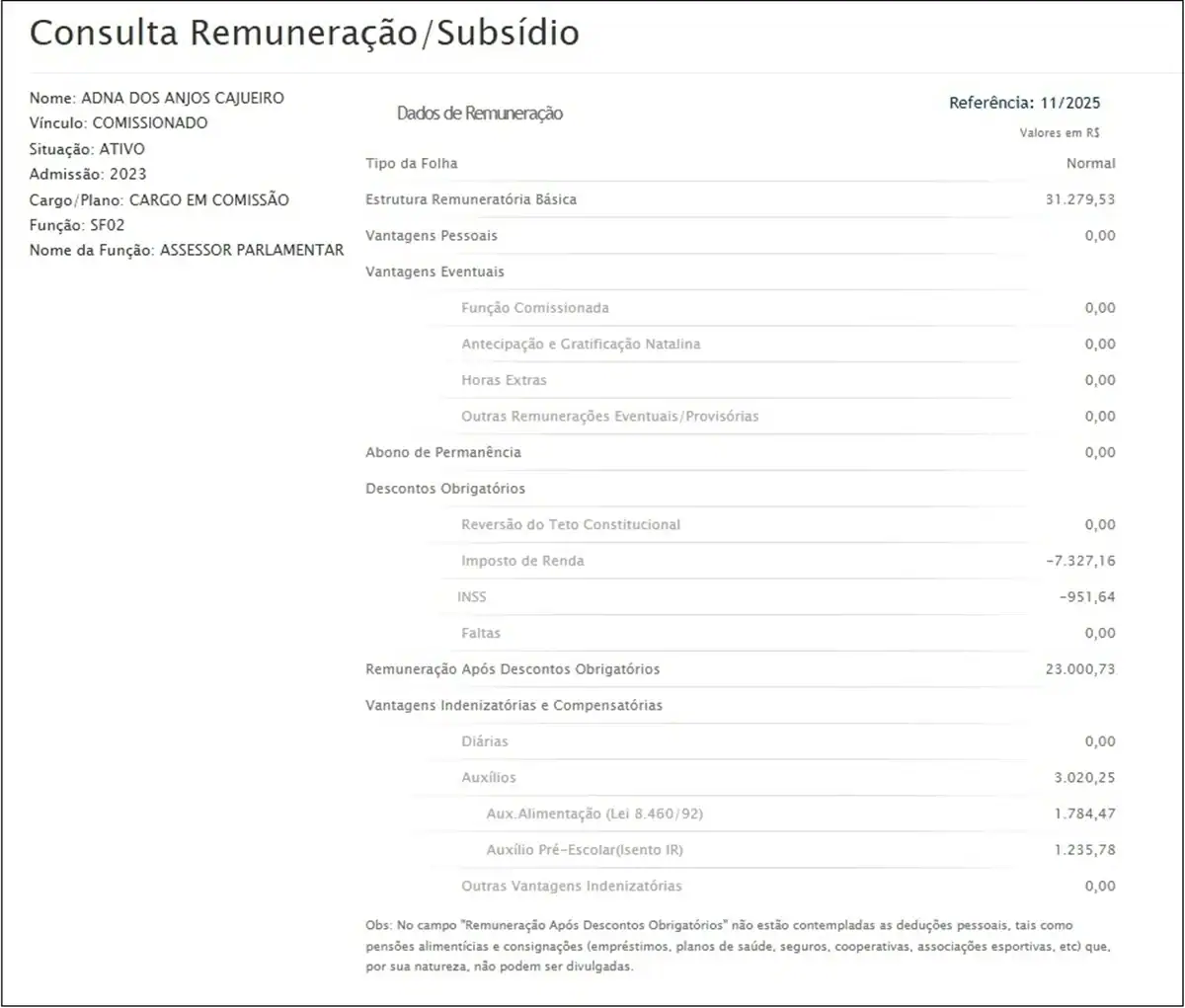 Após ser procurada pela reportagem, Adna deu baixa no CNPJ nesta terça-feira (2/12). Em agosto, ela havia negado ainda atuar como diarista, afirmando ter emprego fixo na Asa Sul, sem mencionar o cargo comissionado no Senado. Desde sua nomeação em outubro de 2023, seu salário subiu de R$ 2,1 mil para mais de R$ 31 mil.