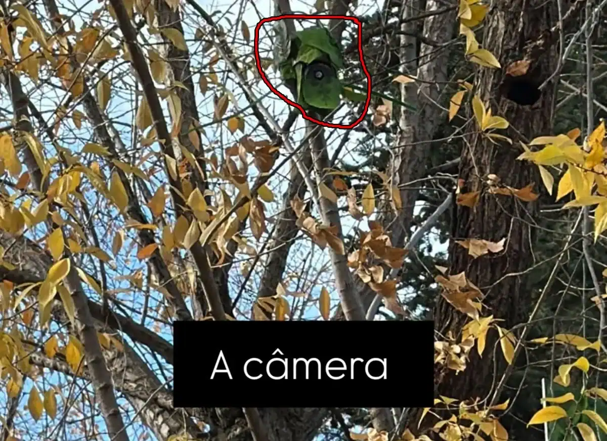 Curioso com o objeto estranho e esverdeado, o vizinho se aproximou e percebeu que se tratava de uma câmera, cuidadosamente escondida entre a vegetação em frente ao portão da casa. Tainá explicou que o local é cercado por mata e que alguém subiu ali intencionalmente para instalar o equipamento de forma camuflada.