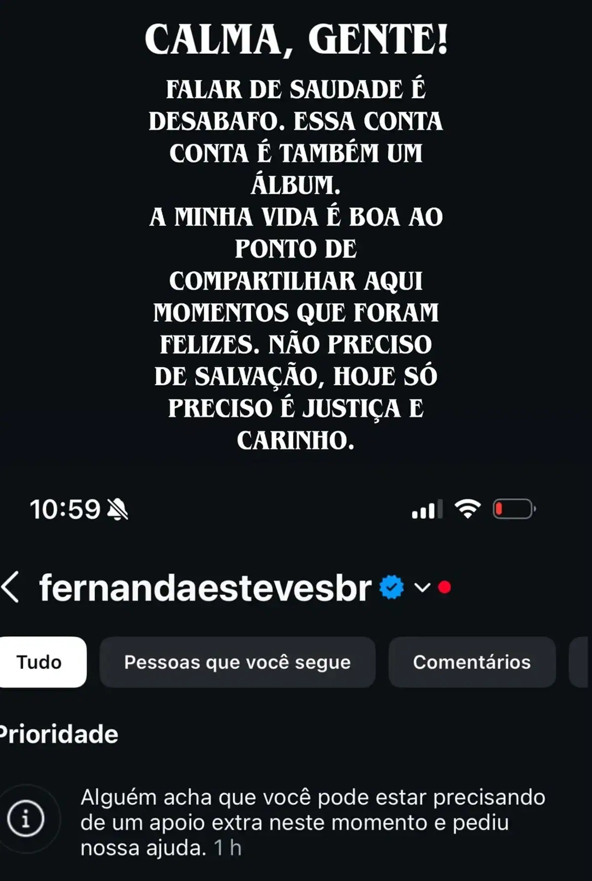 Em sua publicação, Fernanda criticou a superficialidade dos julgamentos feitos online e afirmou que muitas pessoas se preocupam mais em opinar rapidamente do que, de fato, entender o que ela está passando. “Não estão preocupados comigo, estão preocupados em falar qualquer coisa, desde que seja rápido e primeiro”, declarou.