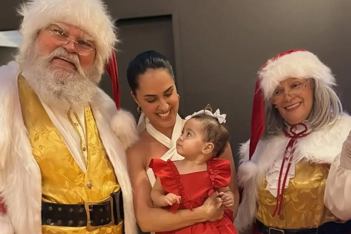 Em uma sequência de fotos publicada no Instagram, Graciele aparece ao lado da filha em diversos cenários decorados com luzes e personagens típicos do Natal. A menina, que tem apenas 11 meses, demonstrou curiosidade e alegria, acenando para as pessoas e observando cada detalhe com os olhos brilhando de emoção.