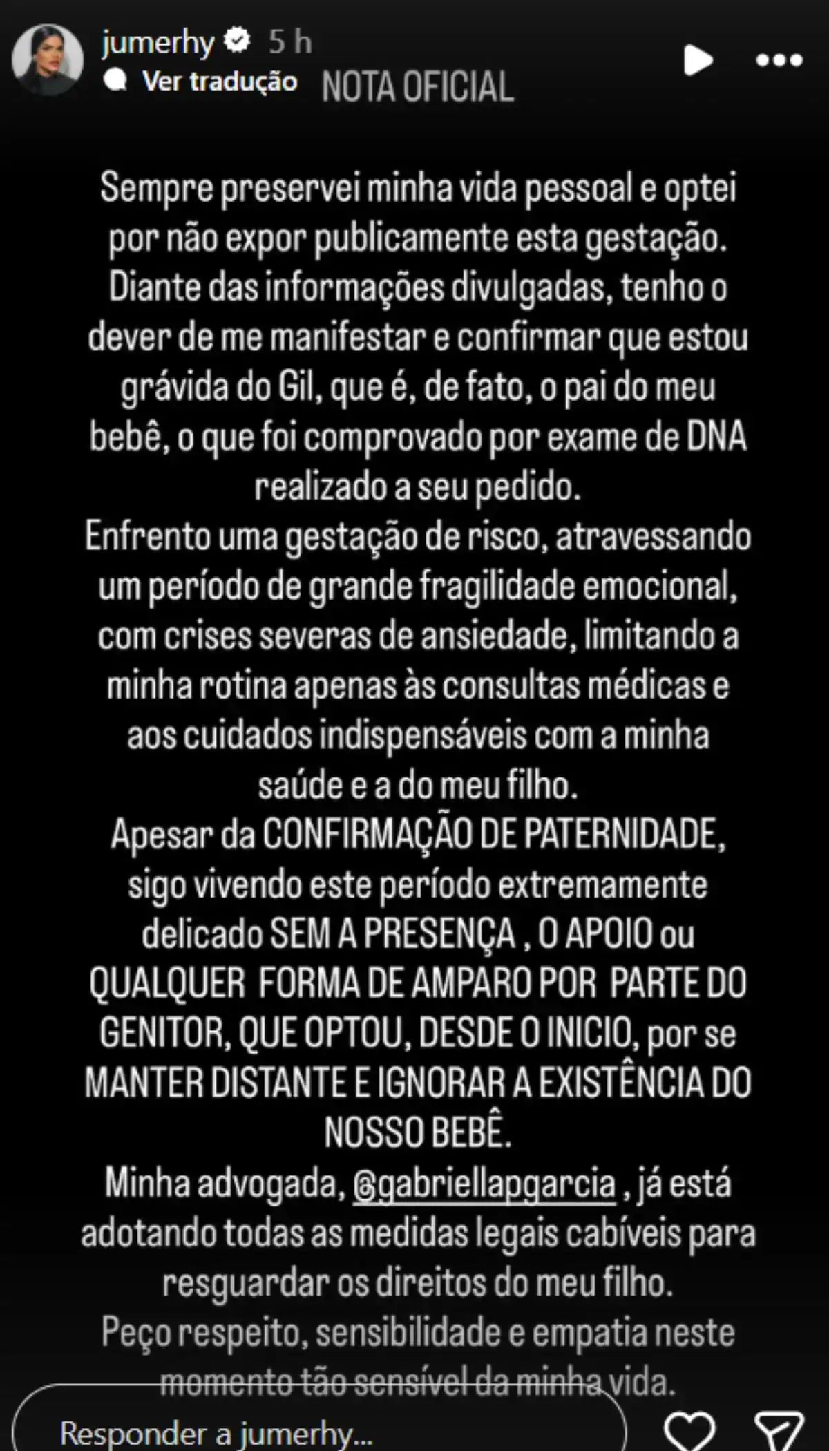 Juliana afirma que, desde a confirmação da paternidade, não teve mais contato com o jogador. Ela também pontua que, mesmo ciente das dificuldades enfrentadas, Gil não ofereceu nenhum tipo de ajuda. A influenciadora, que realiza acompanhamento psicológico e pré-natal com uma das melhores obstetras do Rio, enfrenta uma gravidez de risco, com quadro de placenta prévia, sangramentos frequentes e crises de ansiedade.