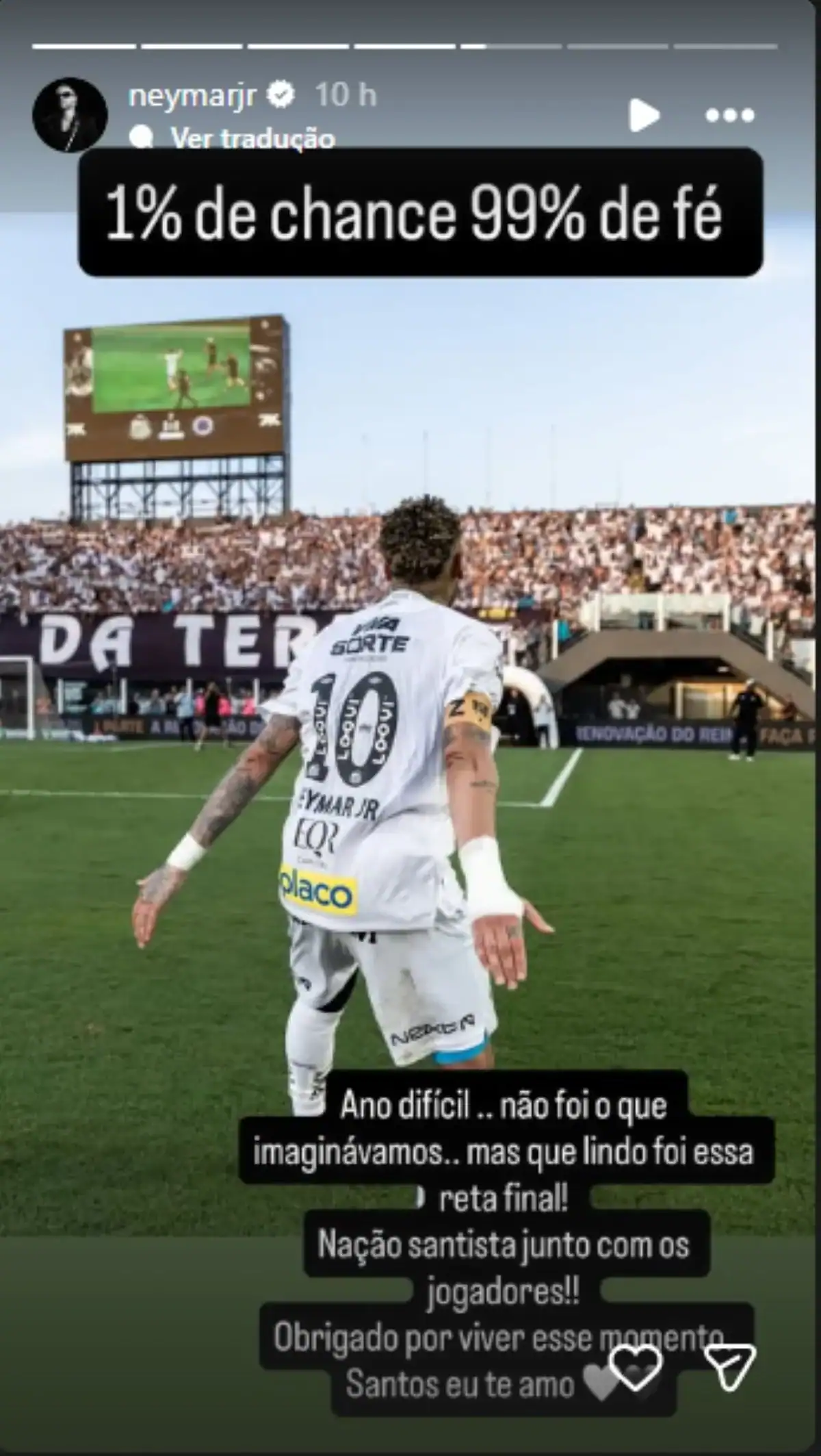 Apesar da polêmica, Neymar não comentou sobre a discussão com Ryan Guilherme. Em suas redes sociais, preferiu destacar a superação do Santos na temporada. “1% de chance, 99% de fé. Ano difícil, não foi o que imaginávamos, mas que lindo foi essa reta final. Nação santista junto com os jogadores. Obrigado por viver esse momento. Santos, eu te amo”, escreveu o craque.