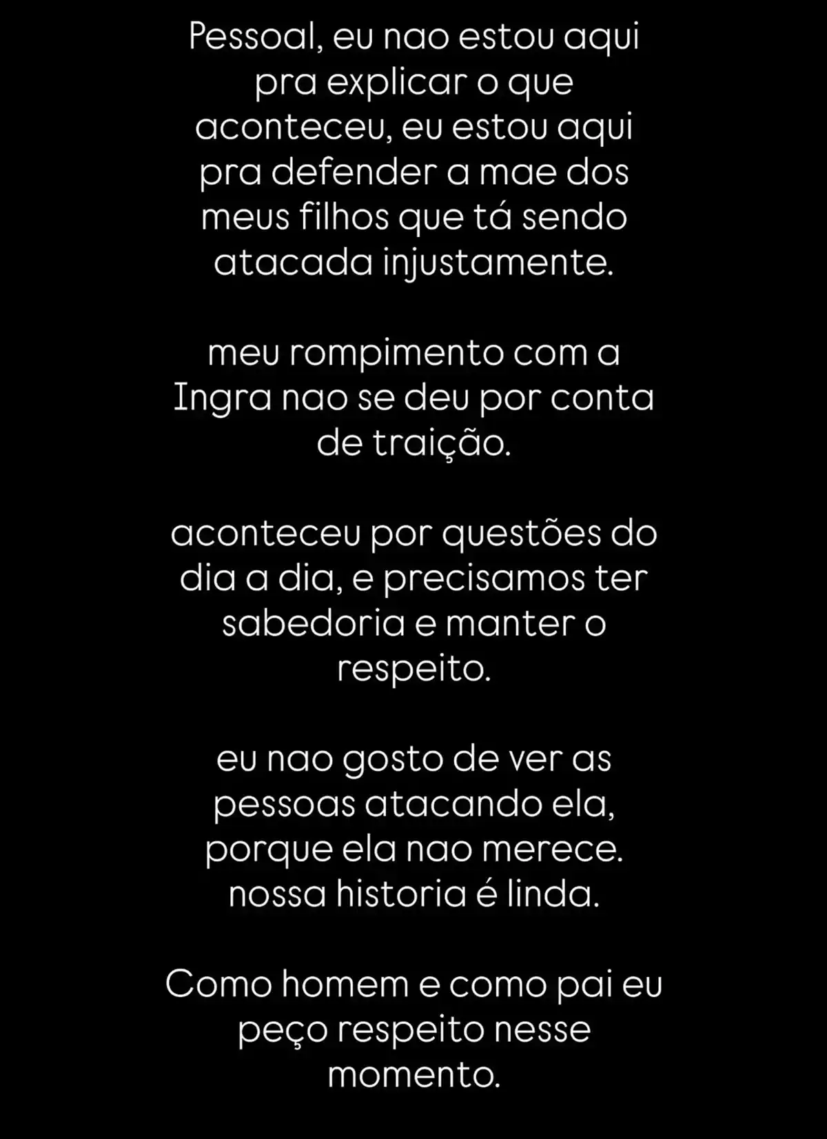 A influenciadora também criticou os ataques que vem recebendo desde o fim do relacionamento. “Tenho sido alvo de pessoas maldosas que tentam destruir minha imagem, sem qualquer prova. A verdade sempre prevalecerá”, afirmou Ingra, negando qualquer atitude que pudesse comprometer a imagem que seus filhos têm dela.