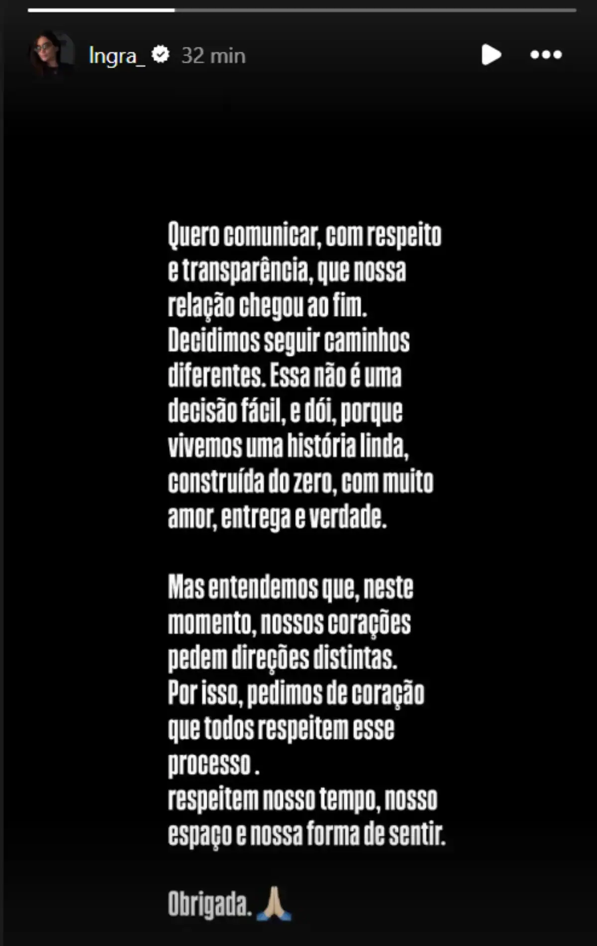 Ele ainda afirmou que a separação foi motivada por dificuldades do cotidiano e pediu respeito ao momento que ambos estão vivendo. “Nossa história é linda. Como homem e pai, peço que respeitem esse momento”, completou o artista.
