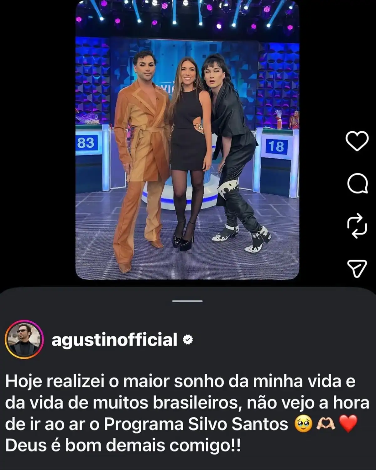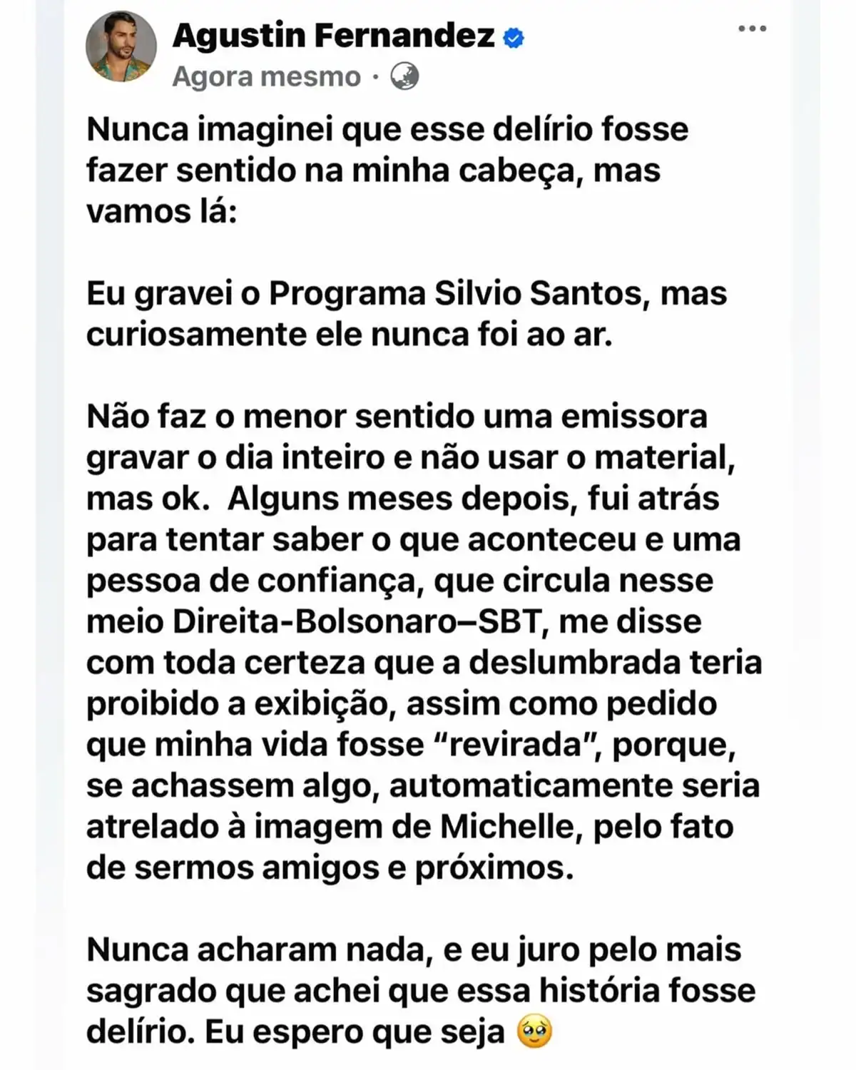 Agustin ainda declarou que, mesmo após investigações, nada foi encontrado contra ele. “Juro por tudo que é sagrado que achei que essa história fosse só um delírio. Espero que ainda seja”, escreveu. No dia da gravação, ele chegou a posar com Patrícia Abravanel e declarou estar realizando um sonho, ansioso para ver sua participação no ar.