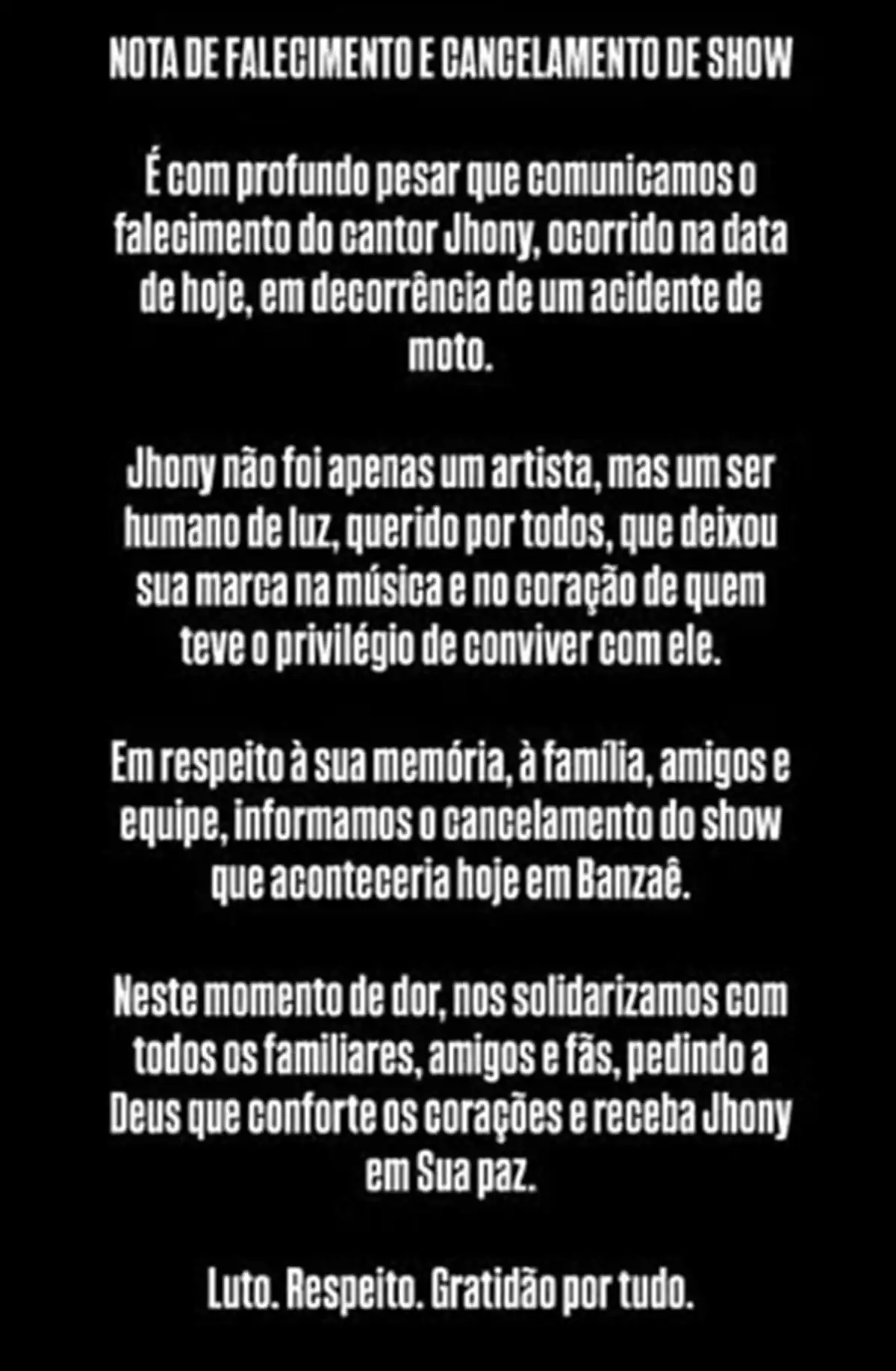 Nas redes sociais, fãs deixaram homenagens emocionadas nas últimas postagens do artista. Muitos destacaram o talento e a energia positiva que Jhony transmitia em suas apresentações. “Você partiu, mas deixou melodias eternas em cada lembrança”, escreveu um seguidor. Outro comentou: “Que Deus te receba com a mesma luz que você espalhou cantando”.