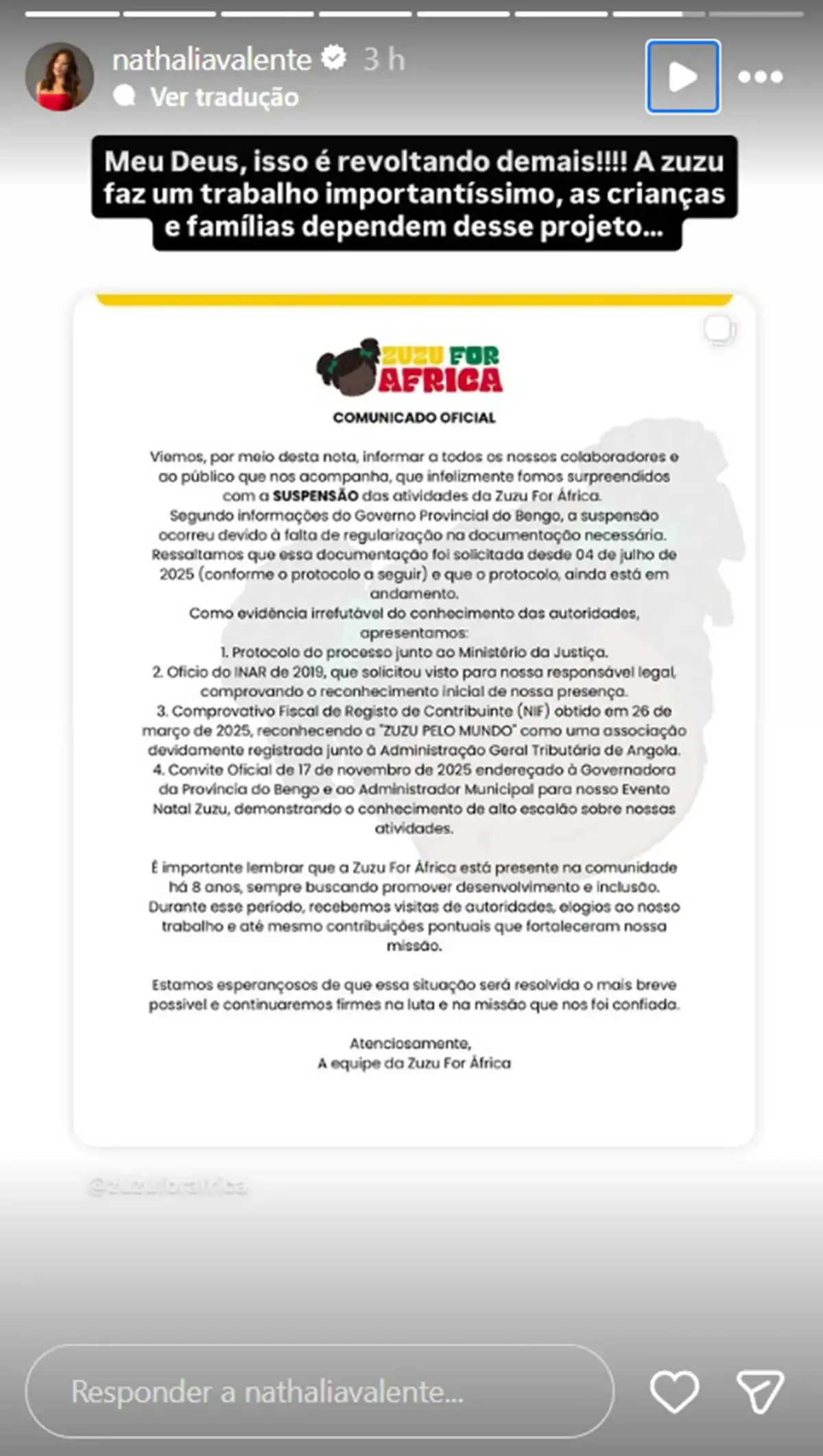 A influenciadora digital Nathalia Valente se pronunciou nas redes sociais após a interrupção das atividades do projeto Zuzu for África, uma iniciativa voltada à proteção da infância em comunidades africanas. A suspensão ocorreu após uma visita de Nathalia e da também influenciadora Mari Menezes à província de Bengo, em Angola, que gerou grande repercussão nas redes sociais.