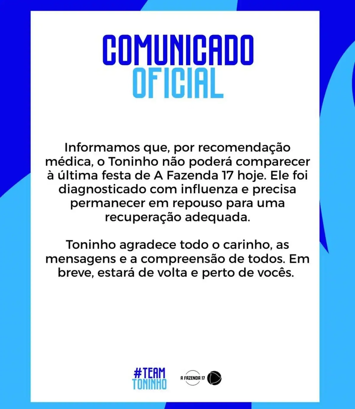 Segundo comunicado divulgado nos stories de seu perfil no Instagram, Toninho foi instruído a manter repouso absoluto para garantir uma recuperação adequada. A equipe do artista informou que, por esse motivo, ele não poderá comparecer aos compromissos finais do programa.