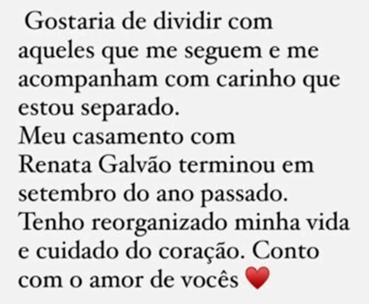 Na publicação feita nas redes sociais, o cantor disse estar reorganizando sua vida e cuidando do coração, sem entrar em detalhes sobre os motivos da separação. Ele também agradeceu o carinho dos fãs ao compartilhar a notícia.