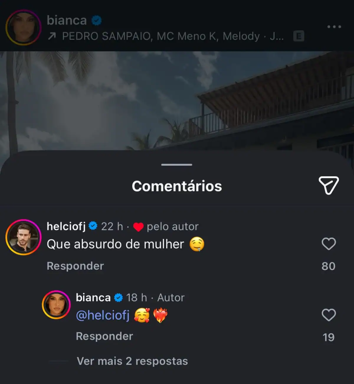 A troca de elogios também chamou a atenção: ao comentar uma publicação de Bianca, Hélcio escreveu “Que absurdo de mulher”, ganhando de volta um coração e emojis apaixonados da empresária.
