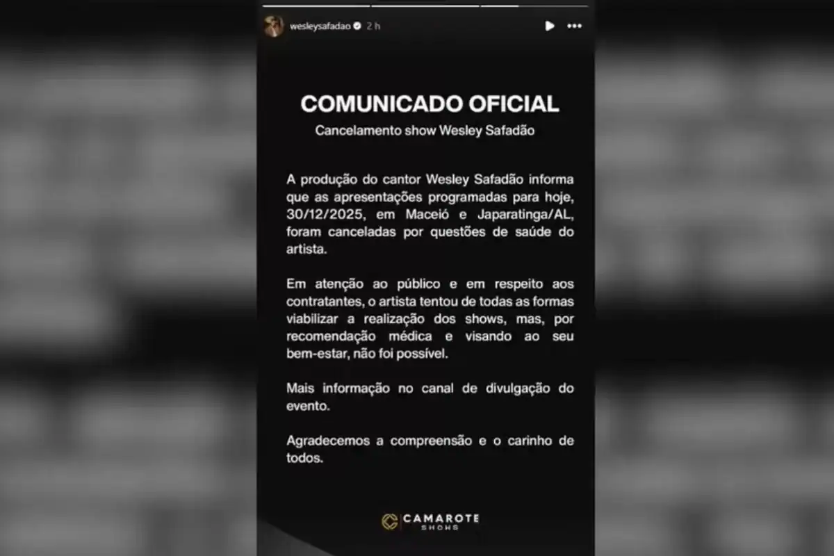 O cantor Wesley Safadão fez um show reduzido em um cruzeiro de fim de ano na última quarta-feira (29/12), encerrando a apresentação antes do tempo habitual e pouco antes de cancelar dois compromissos em Alagoas por questões de saúde.