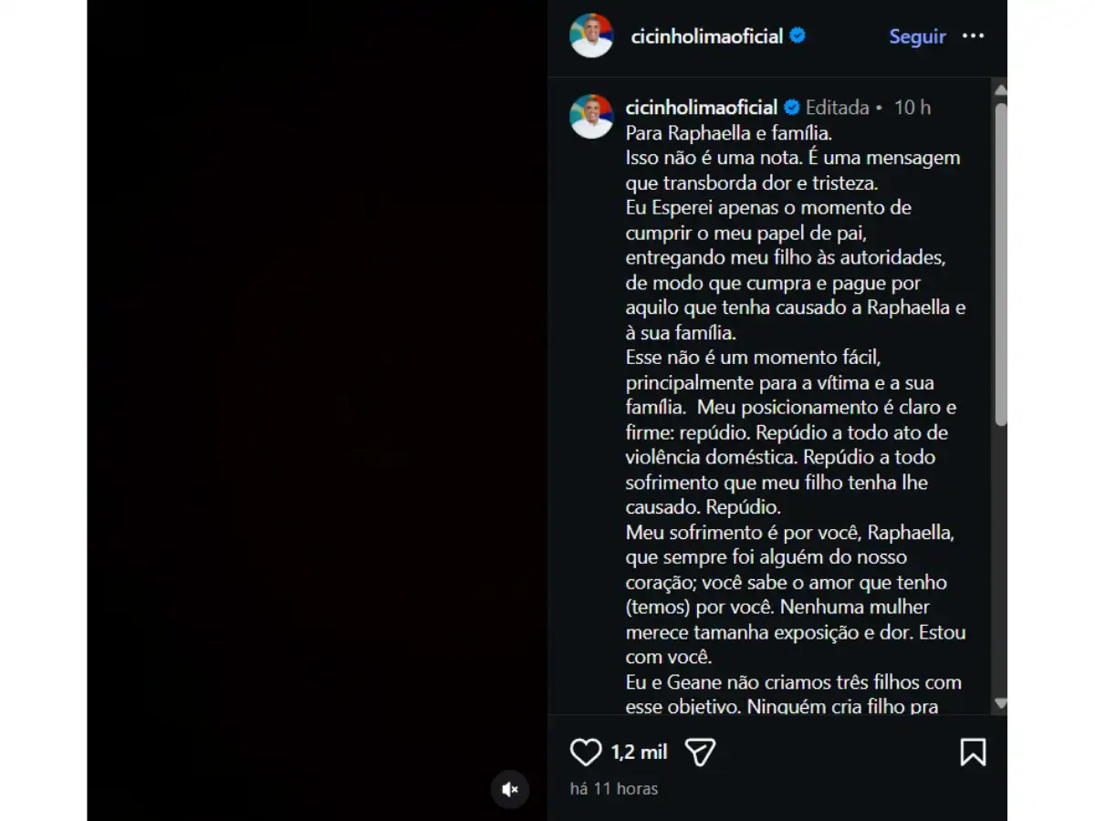 Cocinho Lima começou sua mensagem no Instagram dirigindo-se diretamente a “Raphaella e família” e esclareceu que não se tratava de uma nota oficial, mas de uma comunicação que “transborda dor e tristeza”. Ele enfatizou que aguardou apenas o momento de cumprir seu dever de pai, levando João Lima às autoridades competentes para que responda pelos seus atos diante da justiça.