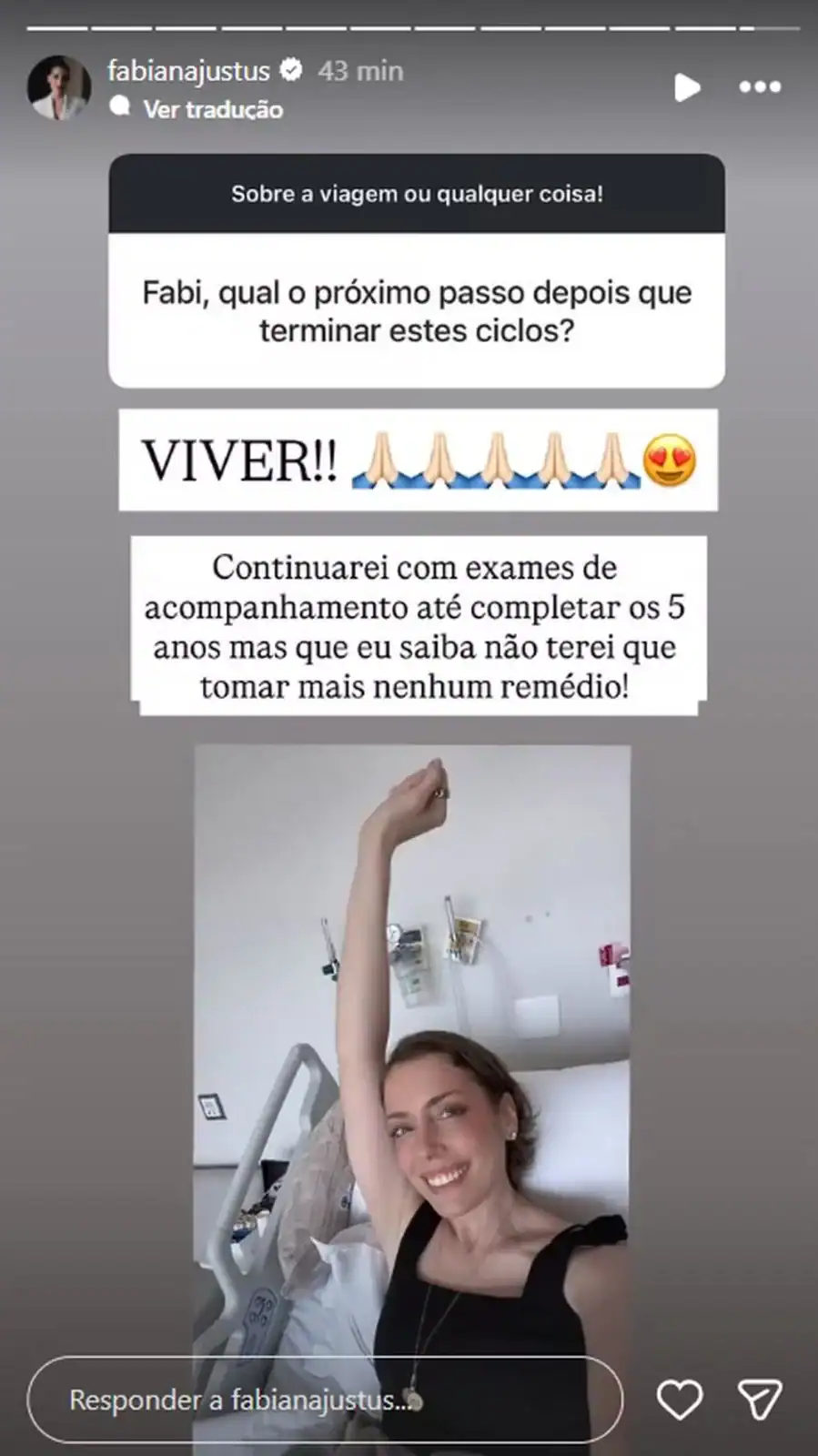 Em resposta a uma das perguntas, Fabiana Justus declarou com emoção: “VIVER!! Vou continuar fazendo exames de acompanhamento até completar cinco anos [de remissão], mas, pelo que sei, não precisarei tomar mais nenhum remédio!”. Esse protocolo de vigilância após a fase inicial de tratamento é comum em casos de leucemia mieloide aguda, em que a estabilidade ao longo de cinco anos de remissão costuma ser associada a um prognóstico mais promissor, considerado em muitos centros médicos como uma meta para avaliar a cura prolongada.