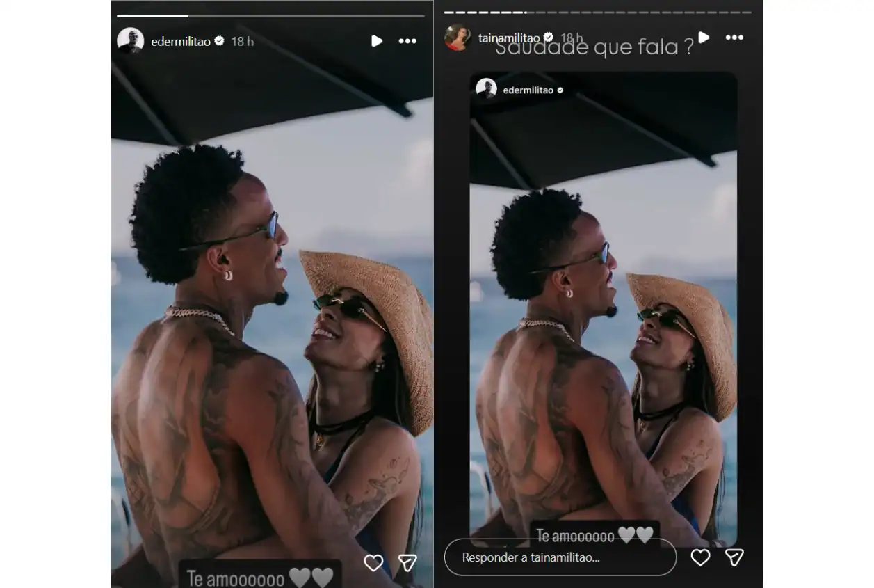 Em recente postagem no Instagram, Éder Militão se declarou de forma apaixonada para Tainá Castro ao compartilhar uma foto em que o casal surge abraçado em uma rede com o mar ao fundo. Na legenda, o jogador de futebol usou palavras carregadas de afeto, reafirmando o quanto valoriza a parceira. A imagem foi publicada no story e, ao repostar no feed, a creatora de conteúdo destacou a saudade que sentiu de um momento especial ao lado do companheiro.
