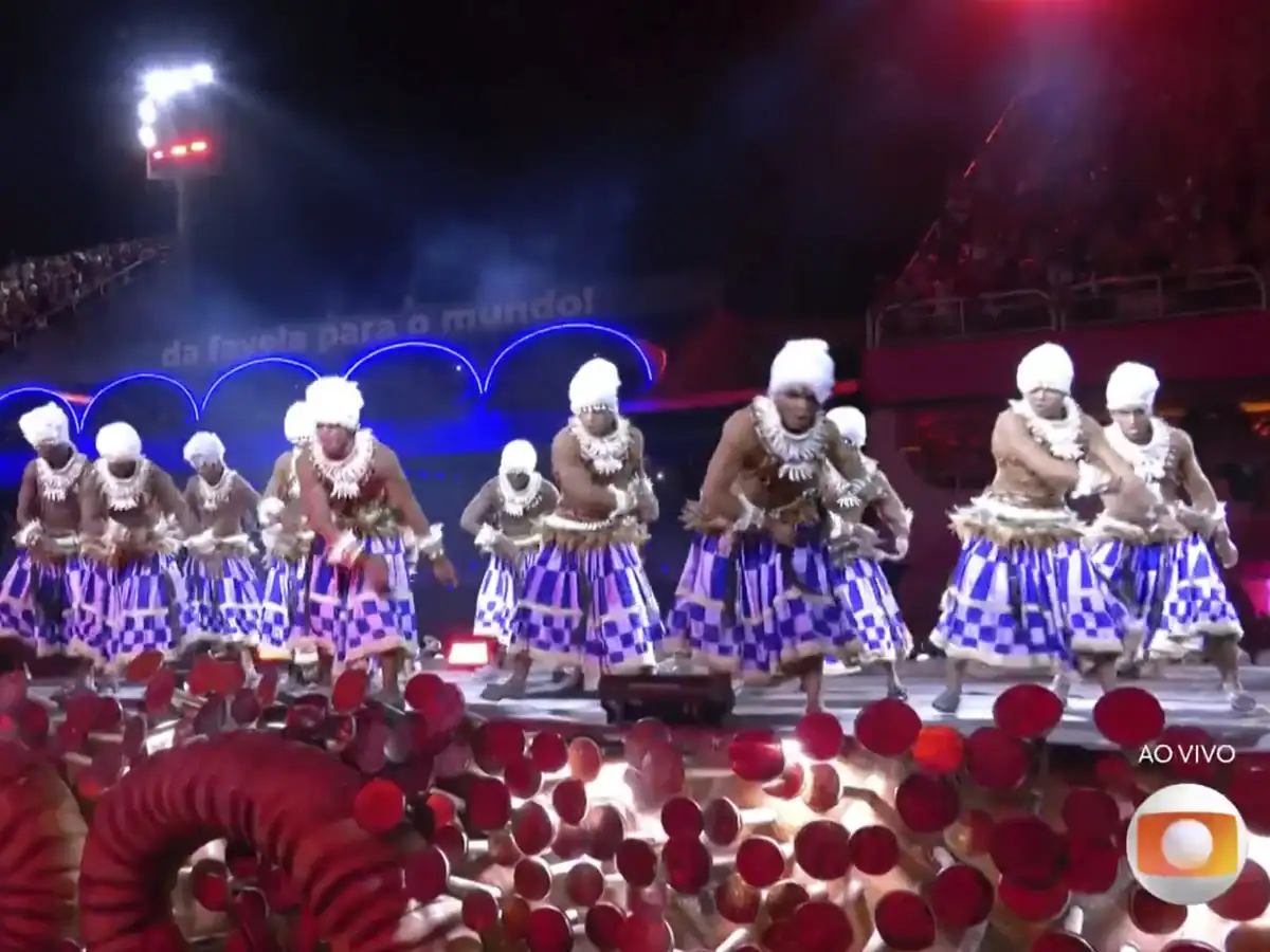 Logo atrás de Cintya Santos e Matheus Olivério, a faixa exibia a frase “A Estação Primeira de Mangueira manifesta todo apoio ao nosso casal Furacão da Mangueira, em defesa da dança ancestral”. A menção ao “Furacão da Mangueira” reforça o vínculo afetivo entre a escola e o casal, ao mesmo tempo em que valoriza a tradição da dança que remete às origens africanas presentes no samba-enredo.