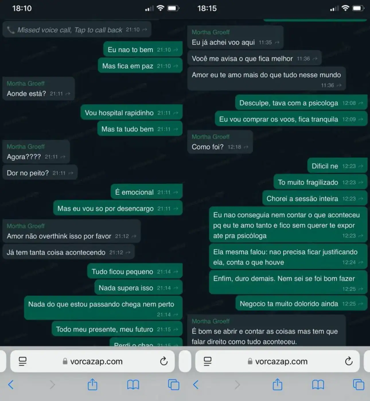 Ainda segundo as mensagens divulgadas, o empresário afirma que teve dificuldade de relatar o ocorrido durante a consulta. “Eu não conseguia nem contar o que aconteceu porque eu te amo tanto e fico sem querer te expor até pra psicóloga”, diz ele. Em seguida, acrescenta: “Ela mesma falou: não precisa ficar justificando ela, conta o que houve”. Ao final do desabafo, Vorcaro afirma: “Enfim, duro demais. Nem sei se foi bom fazer” e “negócio tá muito dolorido ainda”.