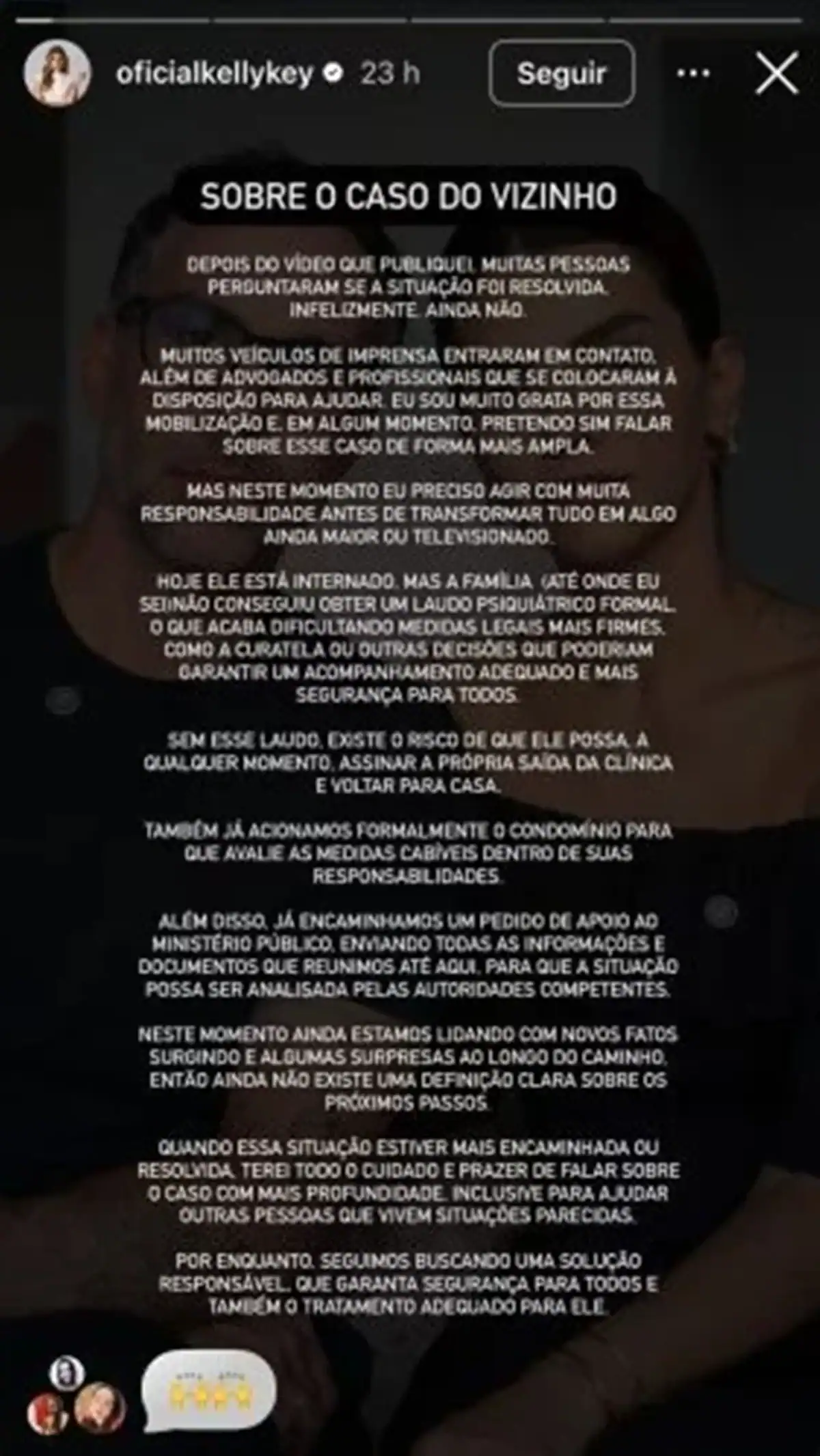 Ela relatou que o comportamento do vizinho tem sido invasivo, chegando a ultrapassar limites aceitáveis. Kelly Key se sente constantemente vigiada e, em algumas ocasiões, já teve que acionar a polícia para lidar com as situações. A artista enfatizou que a situação não é apenas desconfortável, mas também preocupante, pois a segurança dela e de sua família está em jogo.