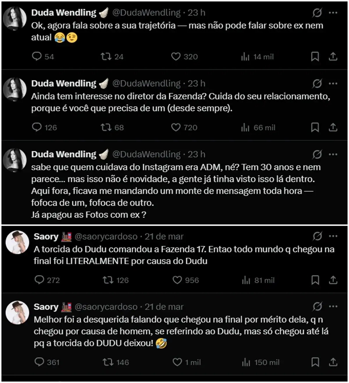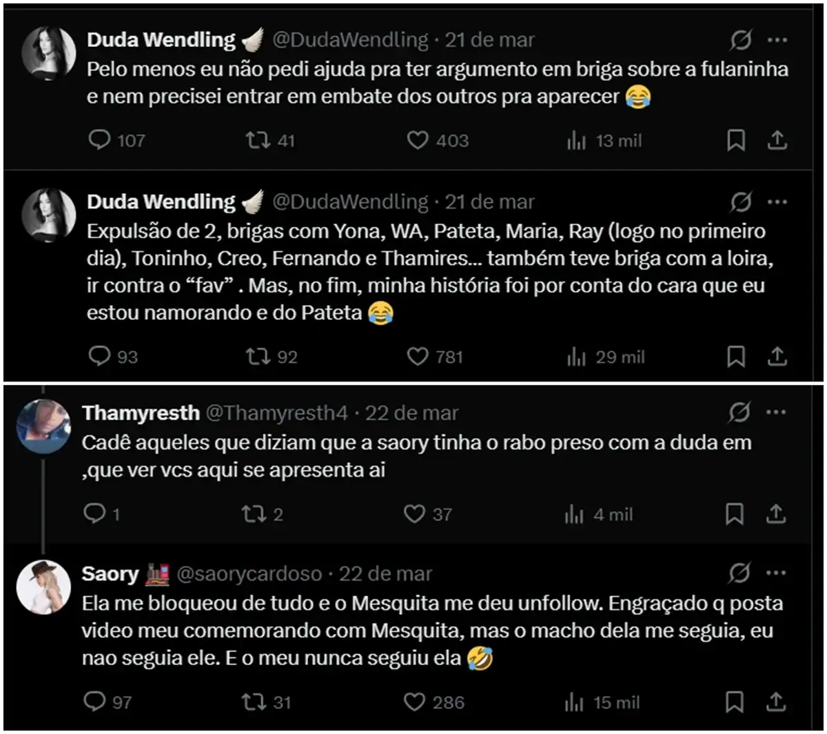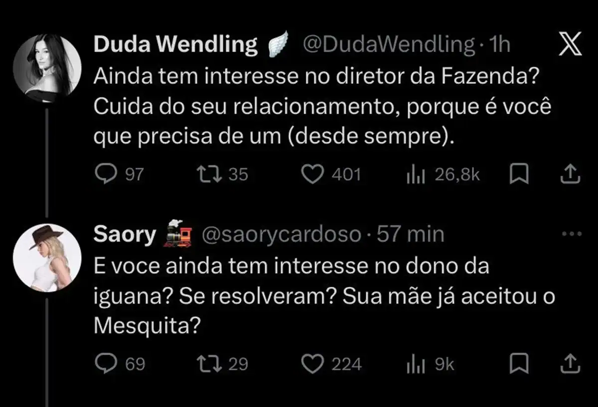 “Pelo menos eu não pedi ajuda pra ter argumento em briga sobre a fulaninha e nem precisei entrar em embate dos outros pra aparecer”, completou Duda também no X. Em seguida, a atriz fez insinuações contra Saory: “Ainda tem interesse no diretor da Fazenda? Cuida do seu relacionamento, porque é você que precisa de um (desde sempre)”, alfinetou.
