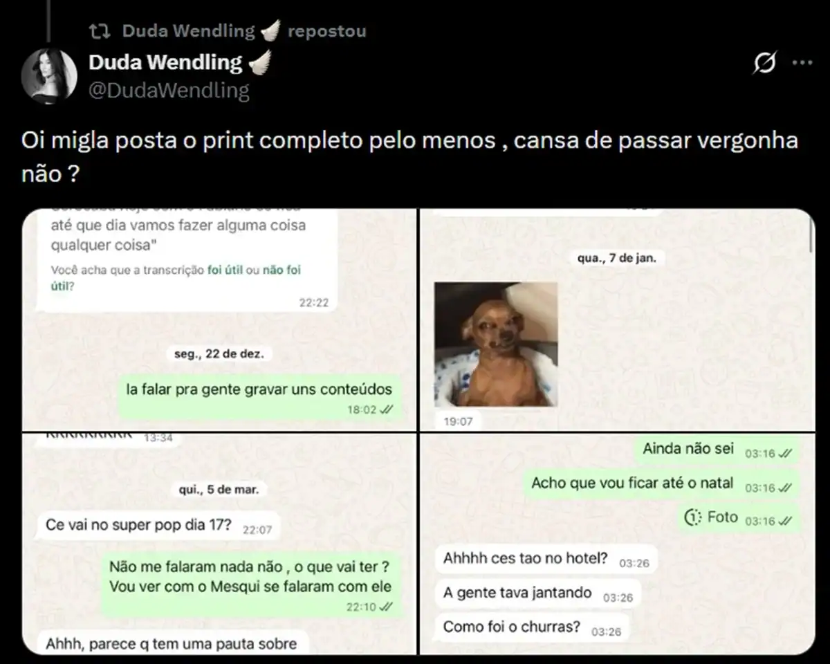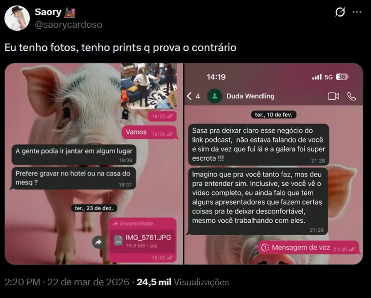 A discussão continuou com Saory Cardoso publicando prints de conversas entre ela e Duda Wendling, nas quais a atriz pedia para “gravar uns conteúdos” com ela. “A gente podia ir jantar em algum lugar”, sugere a namorada de Mesquita.