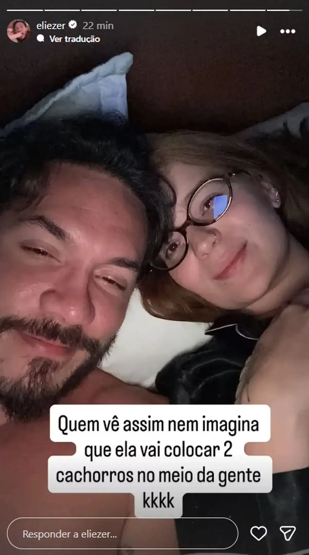 Viih Tube, então, contou que começou a navegar pela rede social sem perceber que estava na conta do marido. “Comecei a ver stories. Fui passando. Amigo, amigo e alguém que eu não conhecia. Amigo, amigo e alguém que eu não conhecia. Falei: ‘Gente, estou seguindo um monte de gente antiga que não conheço mais. Vou dar unfollow’. Comecei a dar unfollow”, declarou Viih. “Detalhe: só mulher”, observou Eliezer.