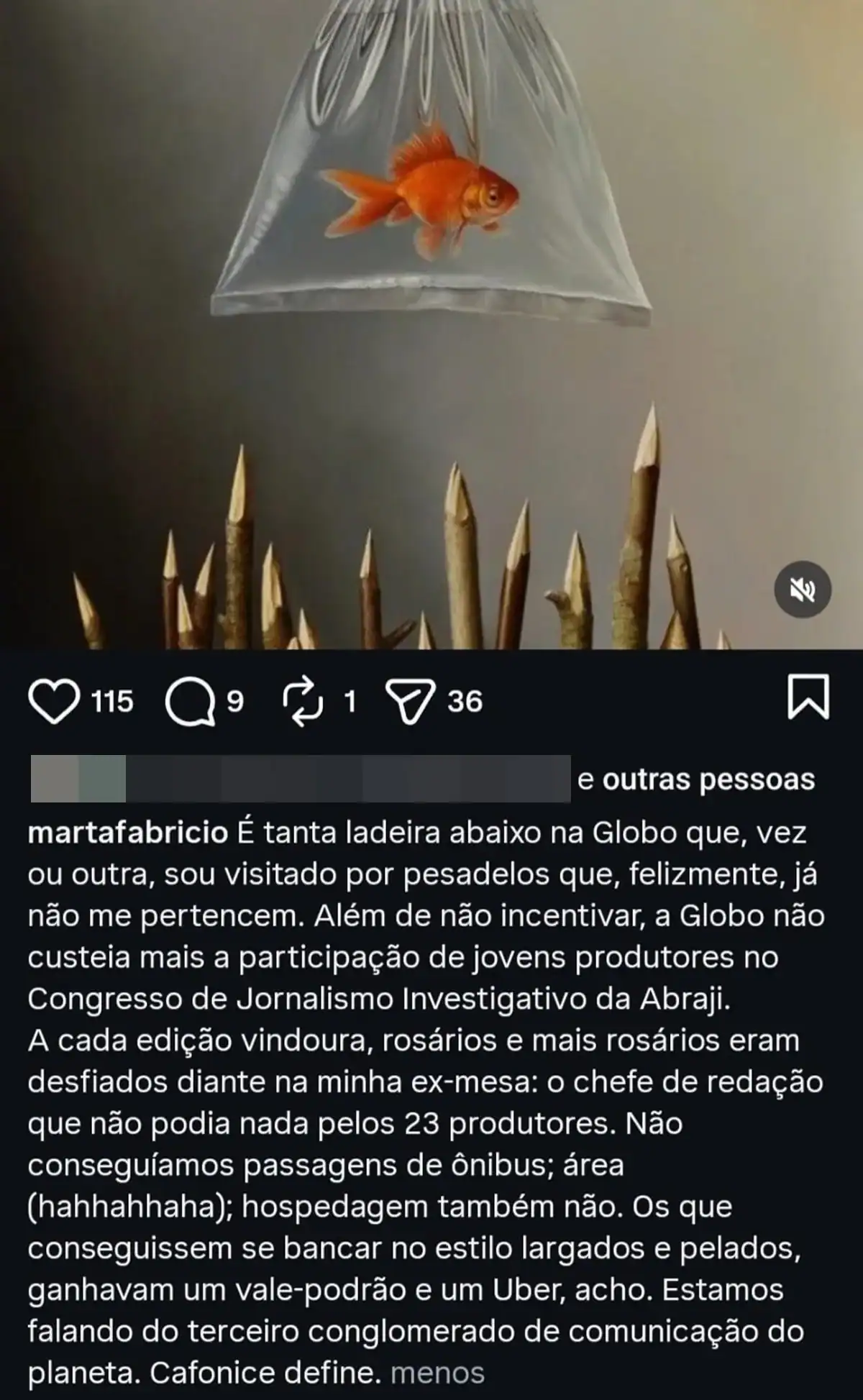 Em outra postagem, Fabricio Marta detonou: “É tanta ladeira abaixo na Globo que, vez ou outra, sou visitado por pesadelos que, felizmente, já não me pertencem. Além de não incentivar, a Globo não custeia mais a participação de jovens produtores no Congresso de Jornalismo Investigativo da Abraji”, observou.