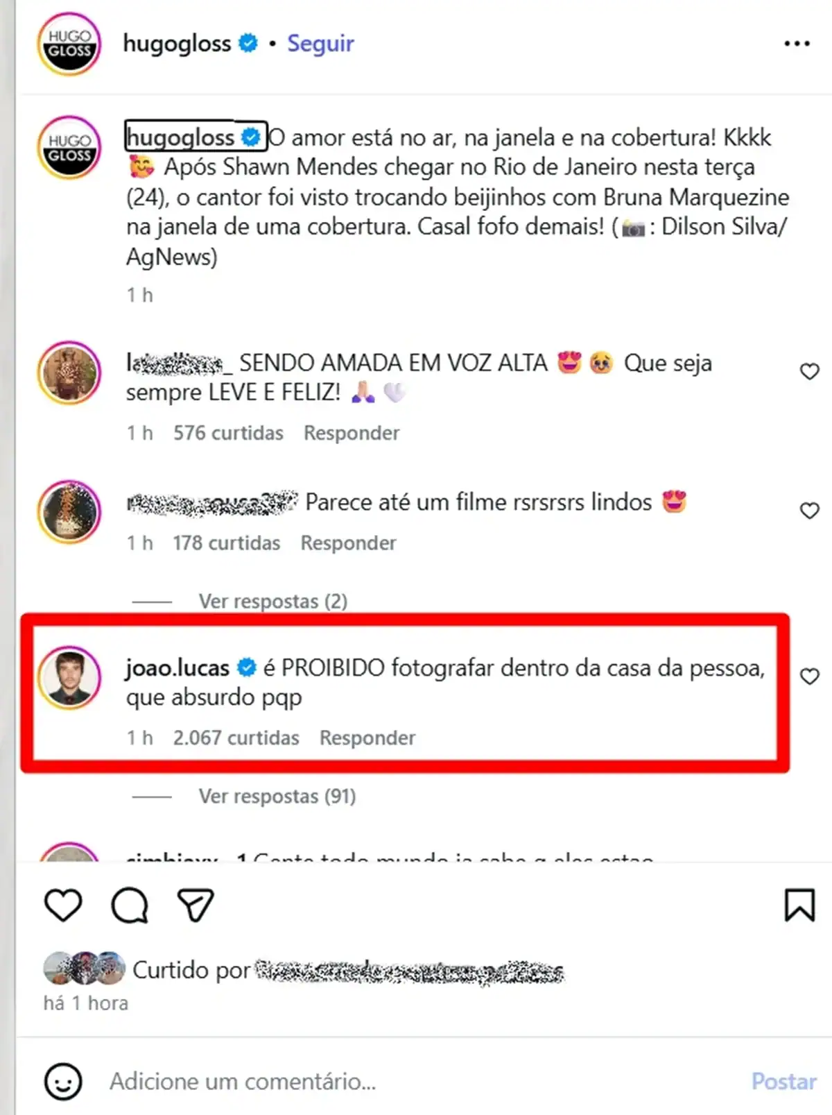 O flagrante gerou reações nas redes sociais, inclusive entre celebridades. João Lucas decidiu se pronunciar após as fotos circularem: “É PROIBIDO fotografar dentro da casa da pessoa, que absurdo pqp”, escreveu o cantor em um comentário no Instagram do perfil Hugo Gloss. O post foi removido logo depois.