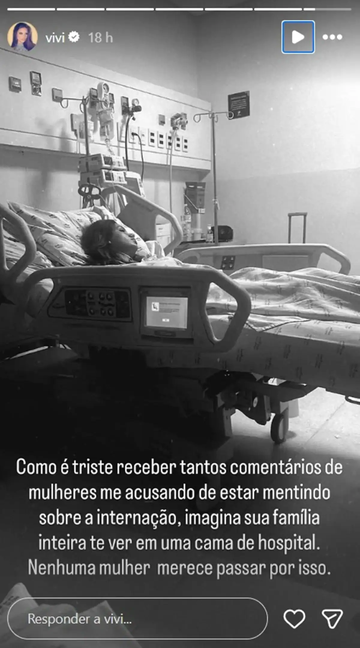 Ainda nos stories do Instagram, Vivi Wanderley afirmou que recebeu comentários de mulheres duvidando de sua internação devido a problemas no relacionamento. Para comprovar, ela postou uma foto em uma cama de hospital e expressou tristeza ao ver mulheres duvidando de seu relato: “Como é triste receber tantos comentários de mulheres me acusando de estar mentindo sobre a internação, imagina sua família inteira te ver em uma cama de hospital. Nenhuma mulher merece passar por isso”, escreveu a famosa.