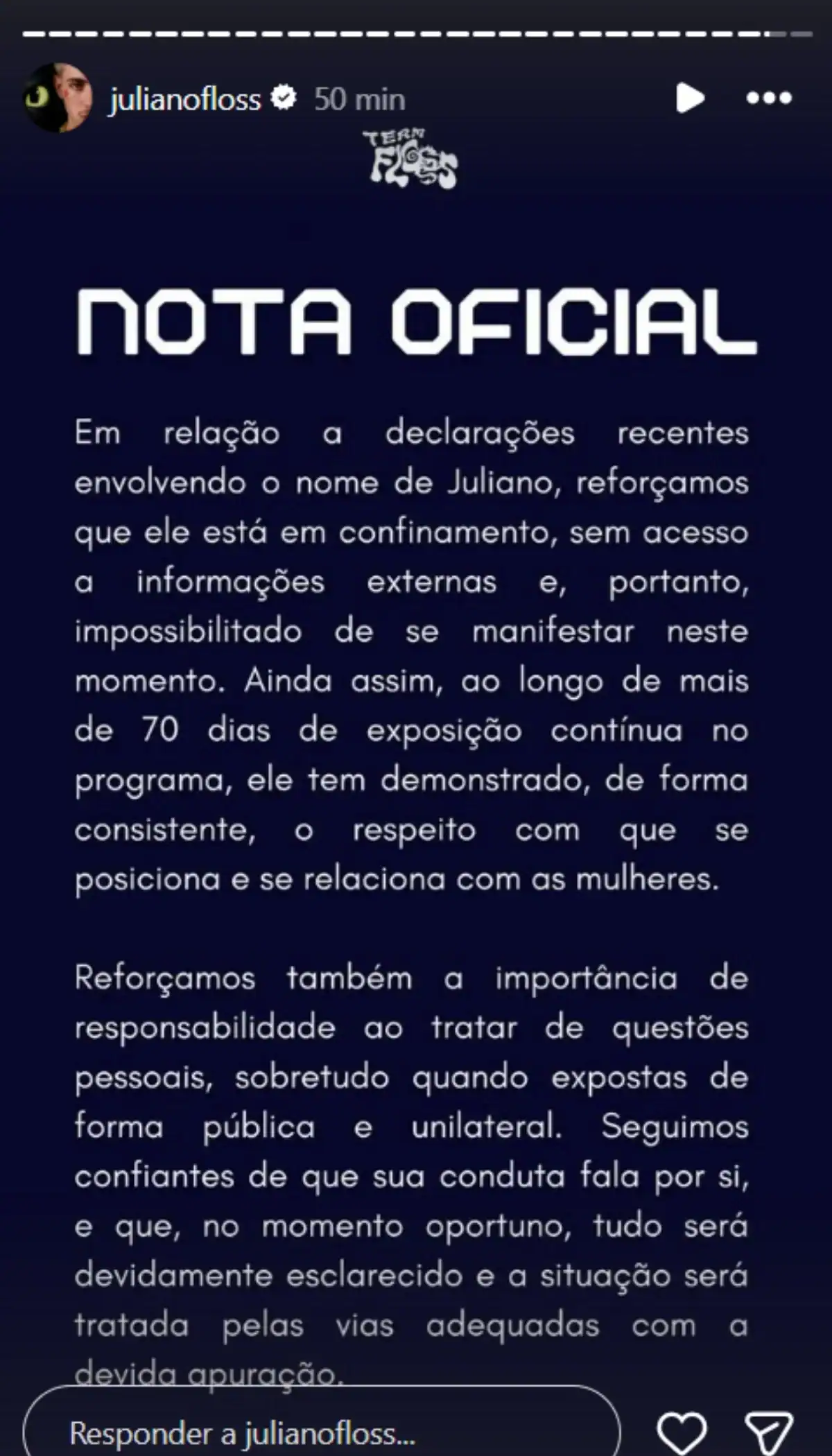 Na nota, a equipe afirmou que Juliano Floss não pode se pronunciar no momento e destacou o comportamento do participante ao longo do reality.
