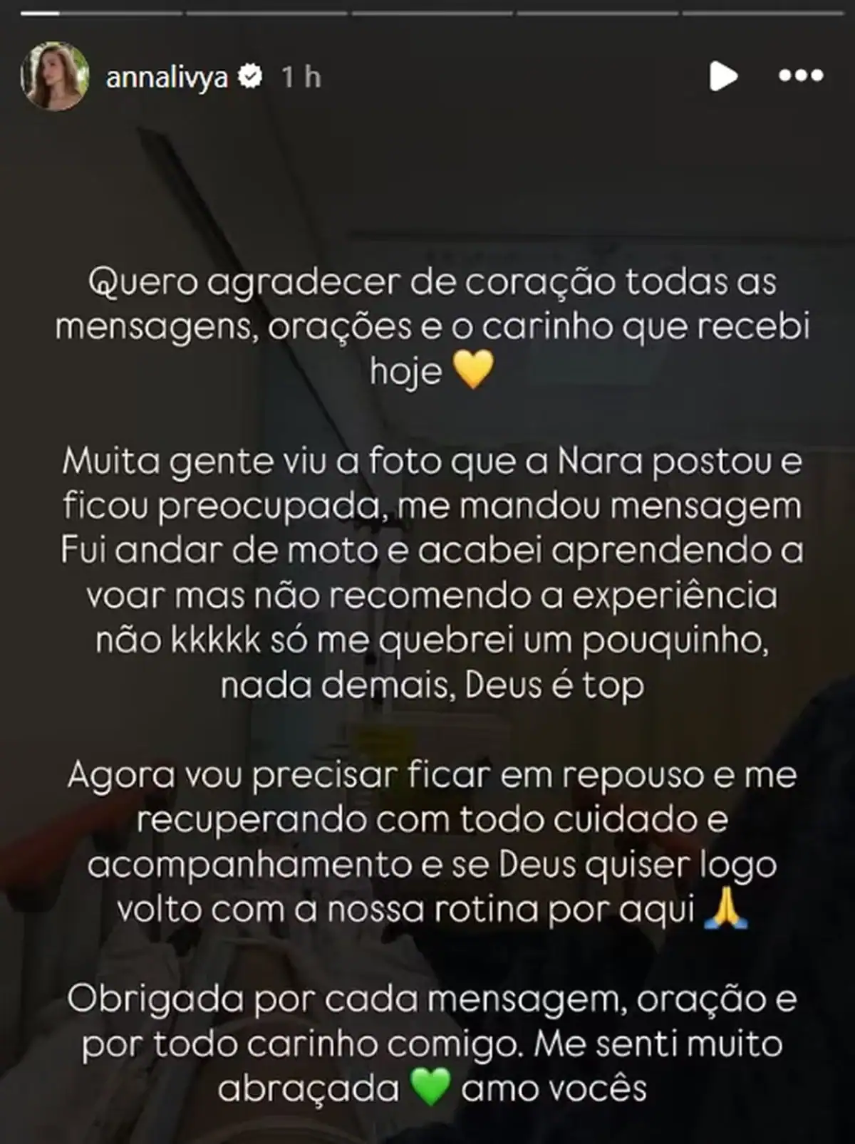 Após a repercussão do caso nas redes sociais, Anna Livya enviou uma mensagem aos fãs: “Quero agradecer de coração todas as mensagens, orações e o carinho que recebi hoje. Muita gente viu a foto que a Nara postou e ficou preocupada, me mandou mensagem”, iniciou.
