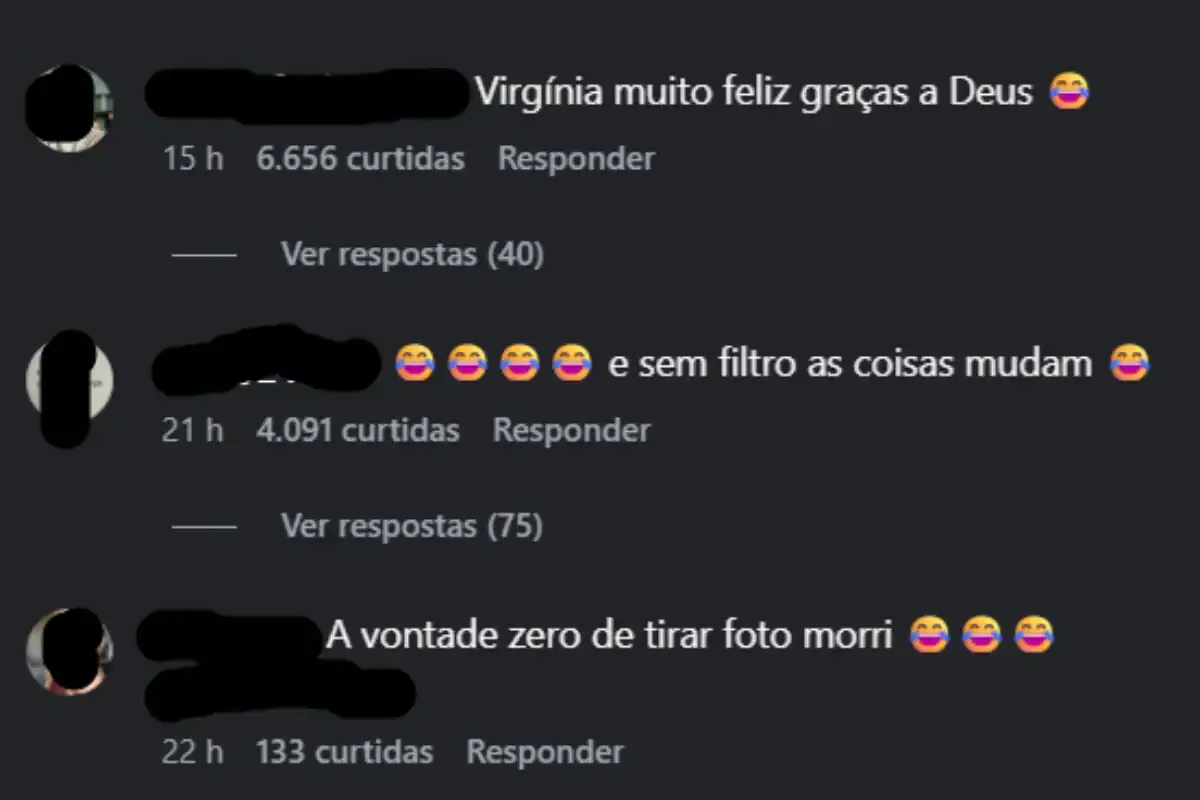 “Virginia muito feliz, graças a Deus”, comentou um perfil. “A vontade zero de tirar foto, morri”, apontou outro. “A cara da Virginia pensando: ‘nem aqui eu tenho um minuto de paz’”, disse um terceiro.