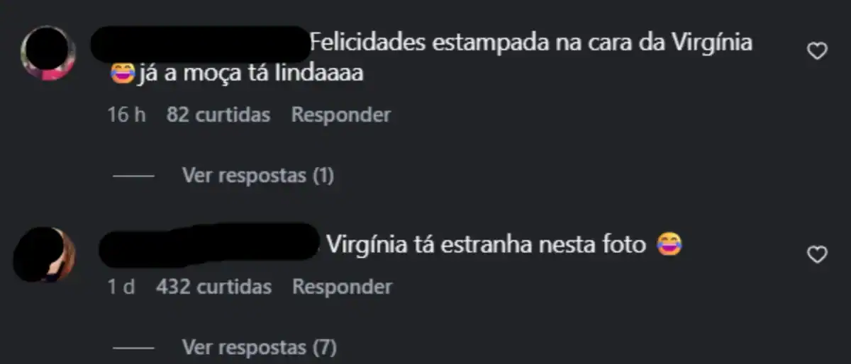 Houve também quem saísse em defesa da influenciadora após críticas à sua aparência. “Vocês falam da Virginia como se vocês fossem lindas em todos os ângulos e em todas as fotos”, defendeu um perfil. “Quantos comentários horrorosos, MDS [meu Deus]. As pessoas perderam a noção total do mínimo de empatia e respeito.”, escreveu outro usuário.