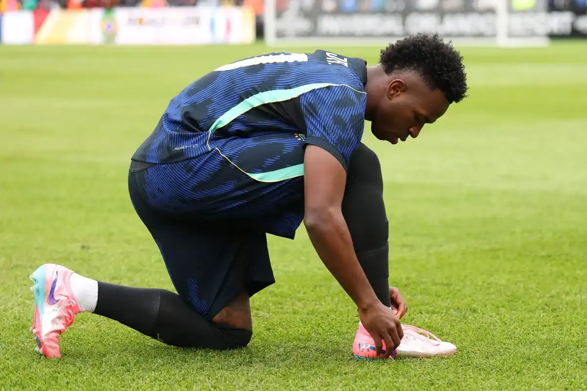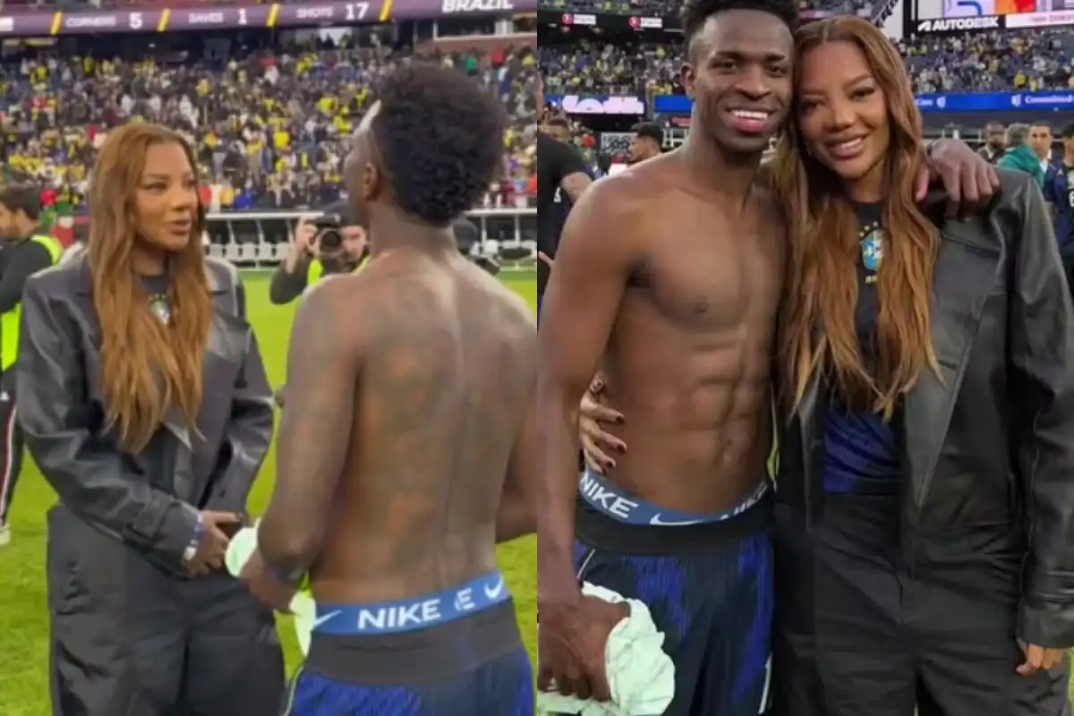 A derrota da Seleção Brasileira para a França por 2 a 1 nesta quinta-feira (26/3), em um amistoso preparatório para a Copa do Mundo, parece não ter abalado o ânimo do jogador Vinícius Júnior. O atleta apareceu em um clima descontraído após a partida, realizada em Orlando (EUA), ao lado da cantora Ludmilla, que enviou um recado para o amigo.