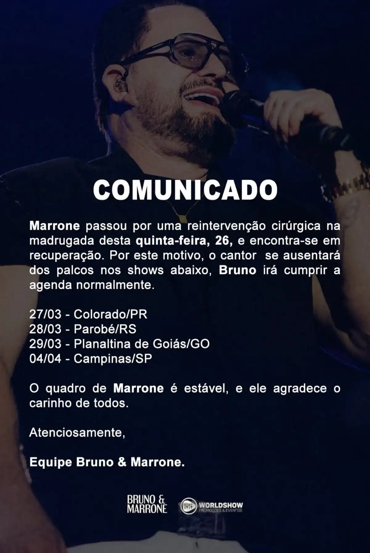 A equipe do sertanejo confirmou a informação na quinta-feira (26/3), por meio dos stories no Instagram do artista: “Comunicado: Marrone passou por uma reintervenção cirúrgica, na madrugada desta quinta-feira, e encontra-se em recuperação“, dizia a nota antes de completar: