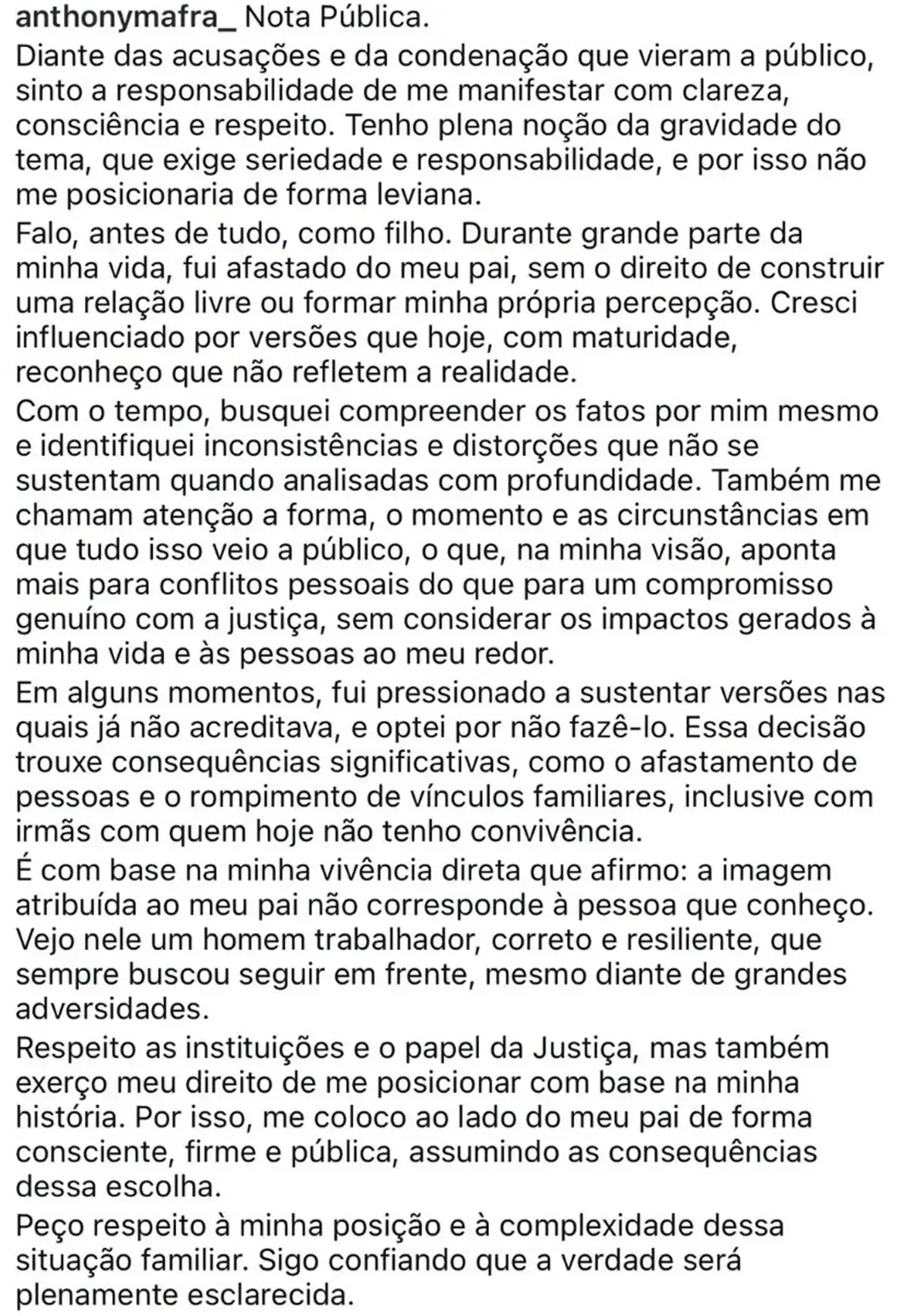 “Nota pública: diante das acusações e da condenação que vieram a público, sinto a responsabilidade de me manifestar com clareza, consciência e respeito. Tenho plena noção da gravidade do tema, que exige seriedade e responsabilidade, e por isso não me posicionaria de forma leviana“, começou Anthony Mafra.