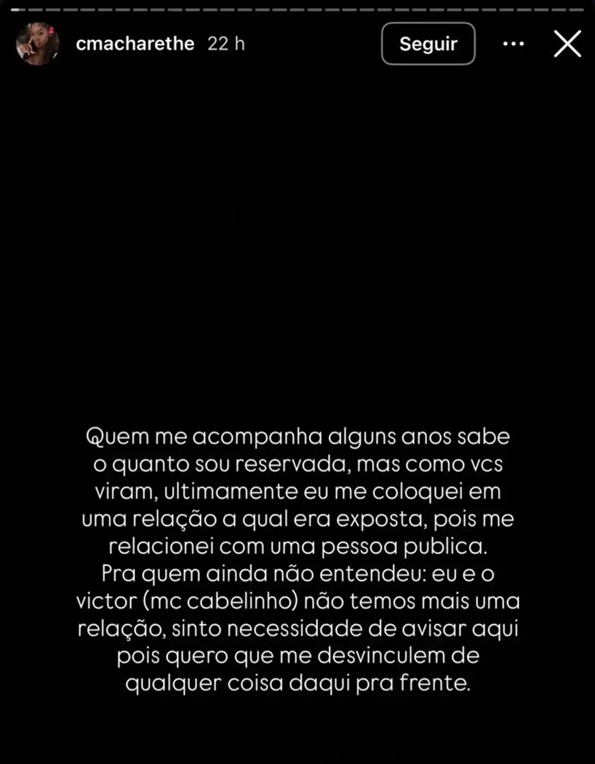 E comentou: “Para quem ainda não entendeu: eu e o Victor (MC Cabelinho) não estamos mais juntos, sinto a necessidade de informar aqui, pois quero que me desvinculem de qualquer coisa daqui para frente”, finalizou Carol, que deixou de seguir o ex nas redes sociais.