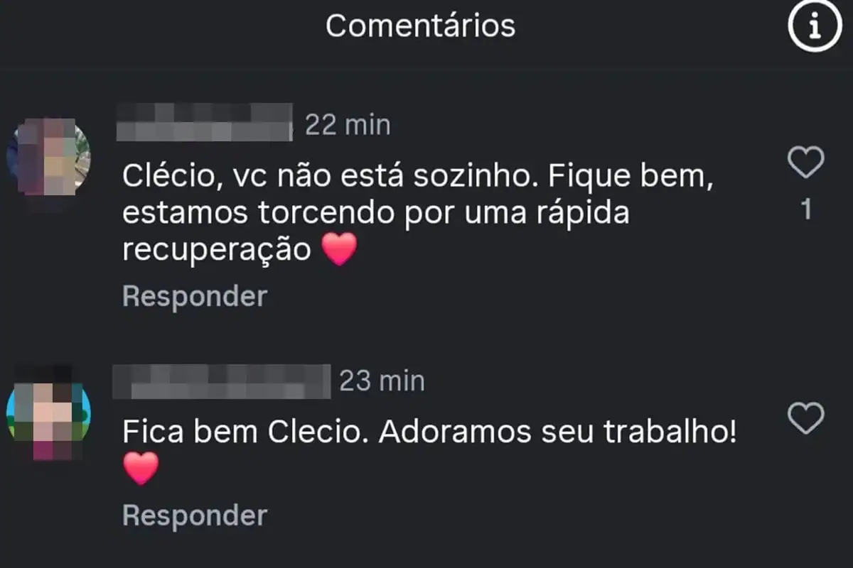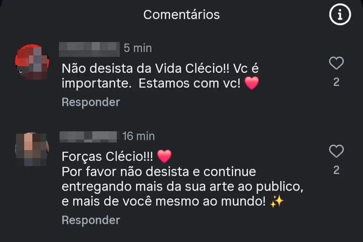 “Não desista da vida, Clécio! Você é importante, estamos com você”, escreveu um seguidor. Outro comentou: “Forças, Clécio! Por favor, não desista e continue entregando mais de sua arte ao público e mais de você mesmo ao mundo”. Um terceiro desejou: “Clécio, você não está sozinho. Fique bem, estamos torcendo por uma rápida recuperação”. “Fica bem, Clécio. Adoramos seu trabalho”, afirmou mais um fã.