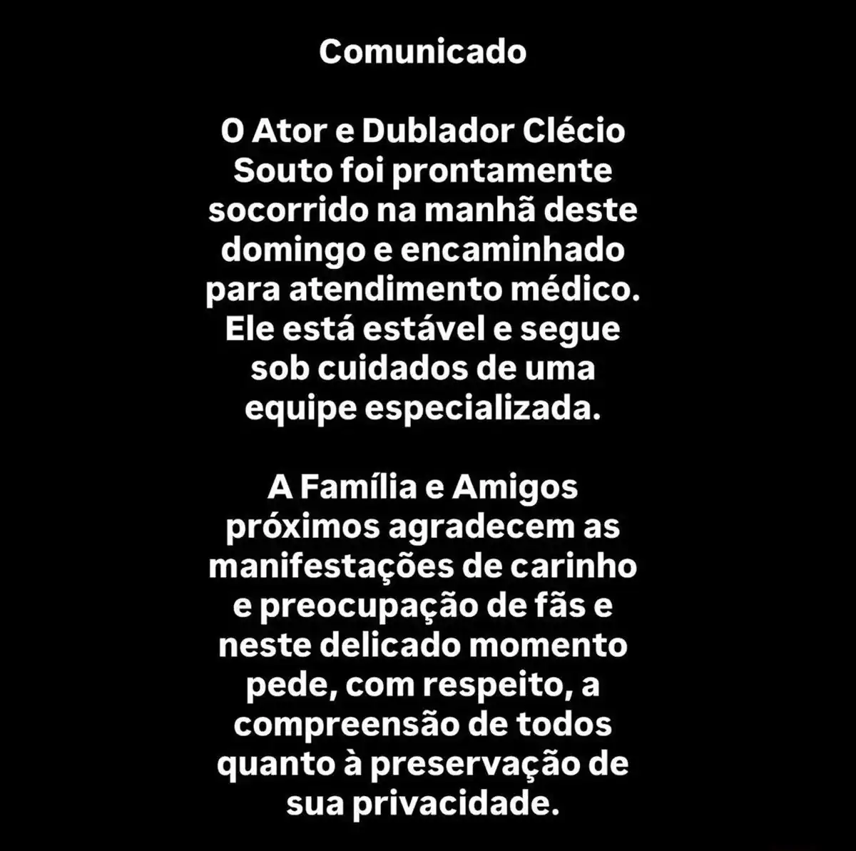 “Comunicado: o ator e dublador Clécio Souto foi prontamente socorrido, na manhã deste domingo, e encaminhado para atendimento médico. Ele está estável e segue sob cuidados de uma equipe especializada”, declarou o texto, assinado por amigos e familiares.