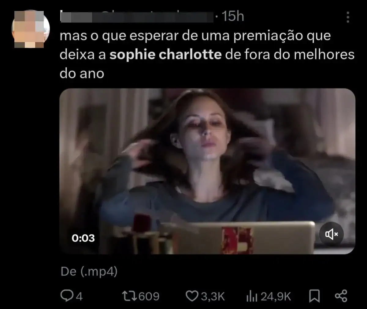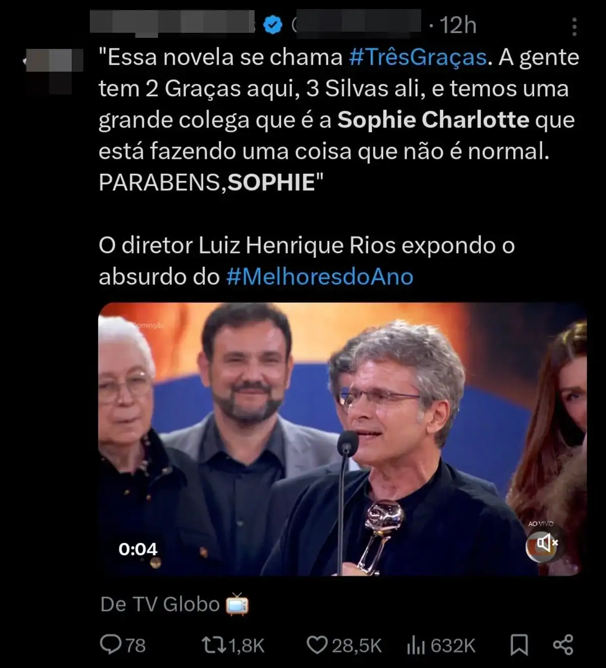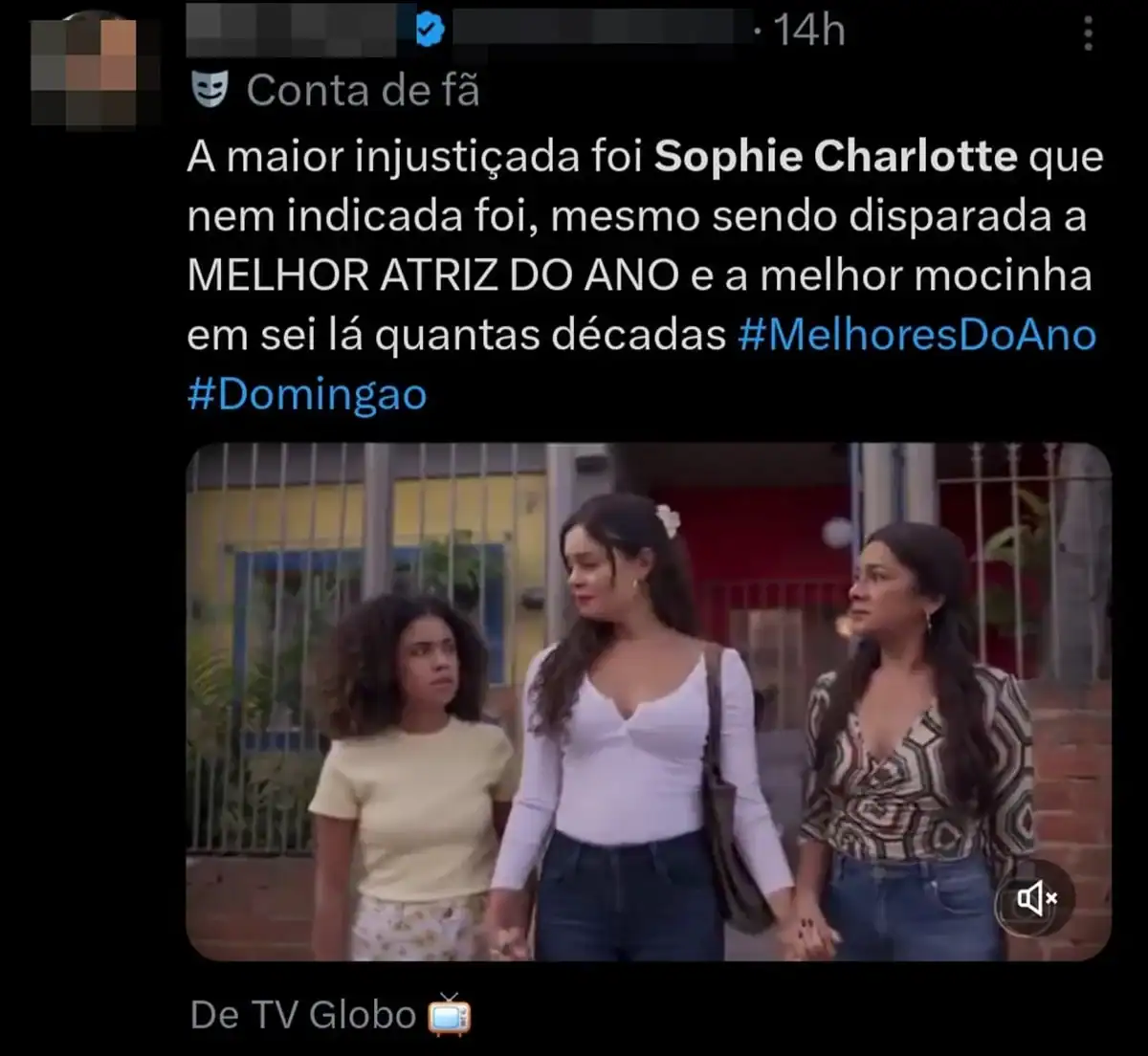 No X, antigo Twitter, os fãs reclamaram: “O diretor Luiz Henrique Rios expondo o absurdo do Melhores do Ano”, escreveu um. “Mas o que esperar de uma premiação que deixa a Sophie Charlotte de fora do Melhores do Ano?”, disse outro. “A maior injustiçada foi Sophie Charlotte que nem indicada foi, mesmo sendo disparada a Melhor Atriz do Ano e a melhor mocinha em sei lá quantas décadas”, opinou uma terceira.
