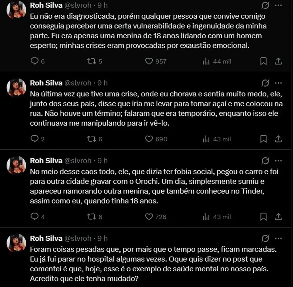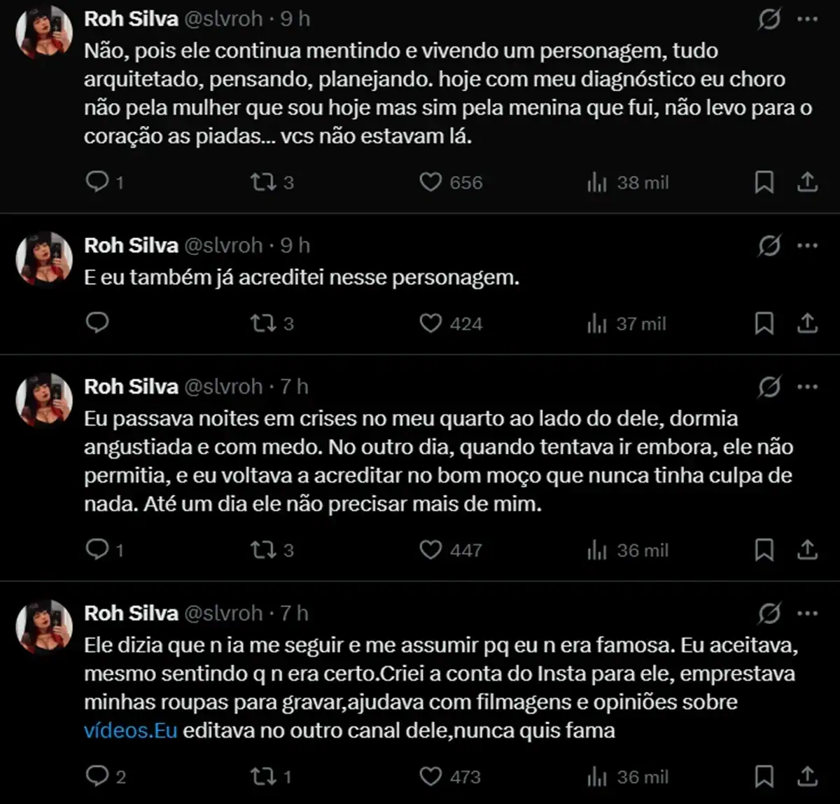 Ao concluir seu relato, Roh Silva afirmou que foi hospitalizada diversas vezes devido aos problemas enfrentados durante a relação e que Felca continua manipulando e mentindo para os seguidores, já que ele vive um “personagem”: