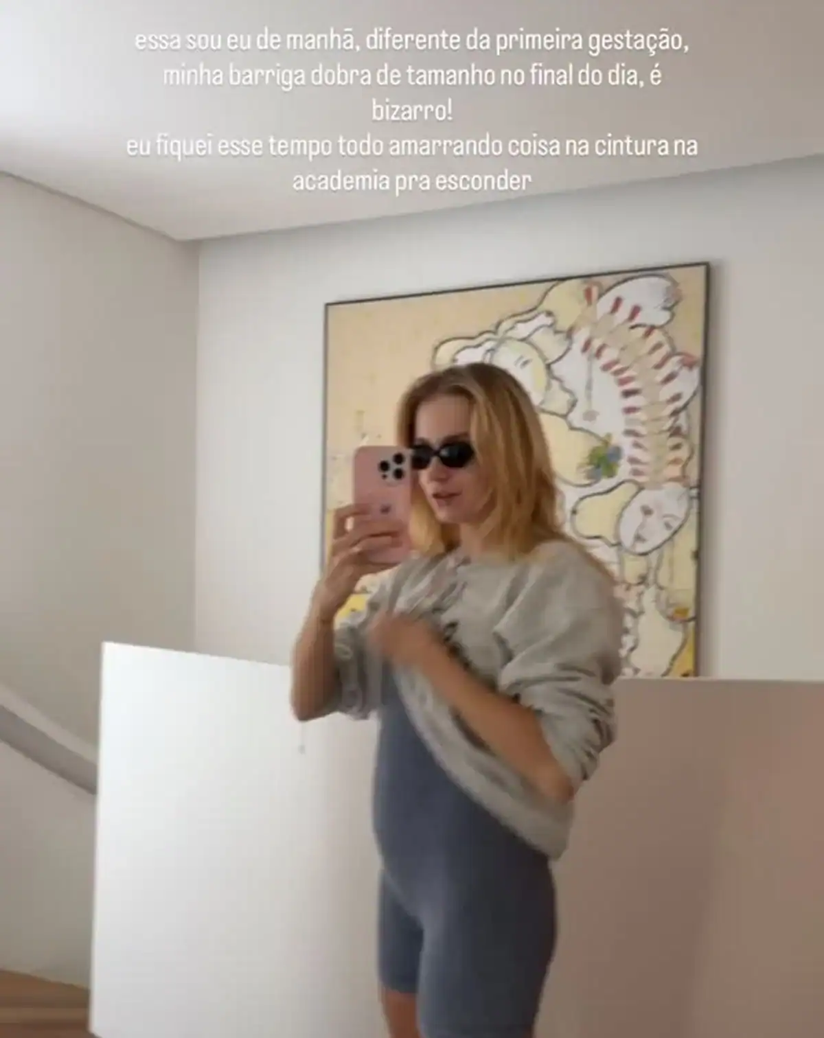 Em outra postagem, ela mostrou o tamanho da barriga e comparou com suas duas gestações: “Essa sou eu de manhã. Diferente da primeira gestação, minha barriga dobra de tamanho no final do dia. É bizarro!”, contou Isa.