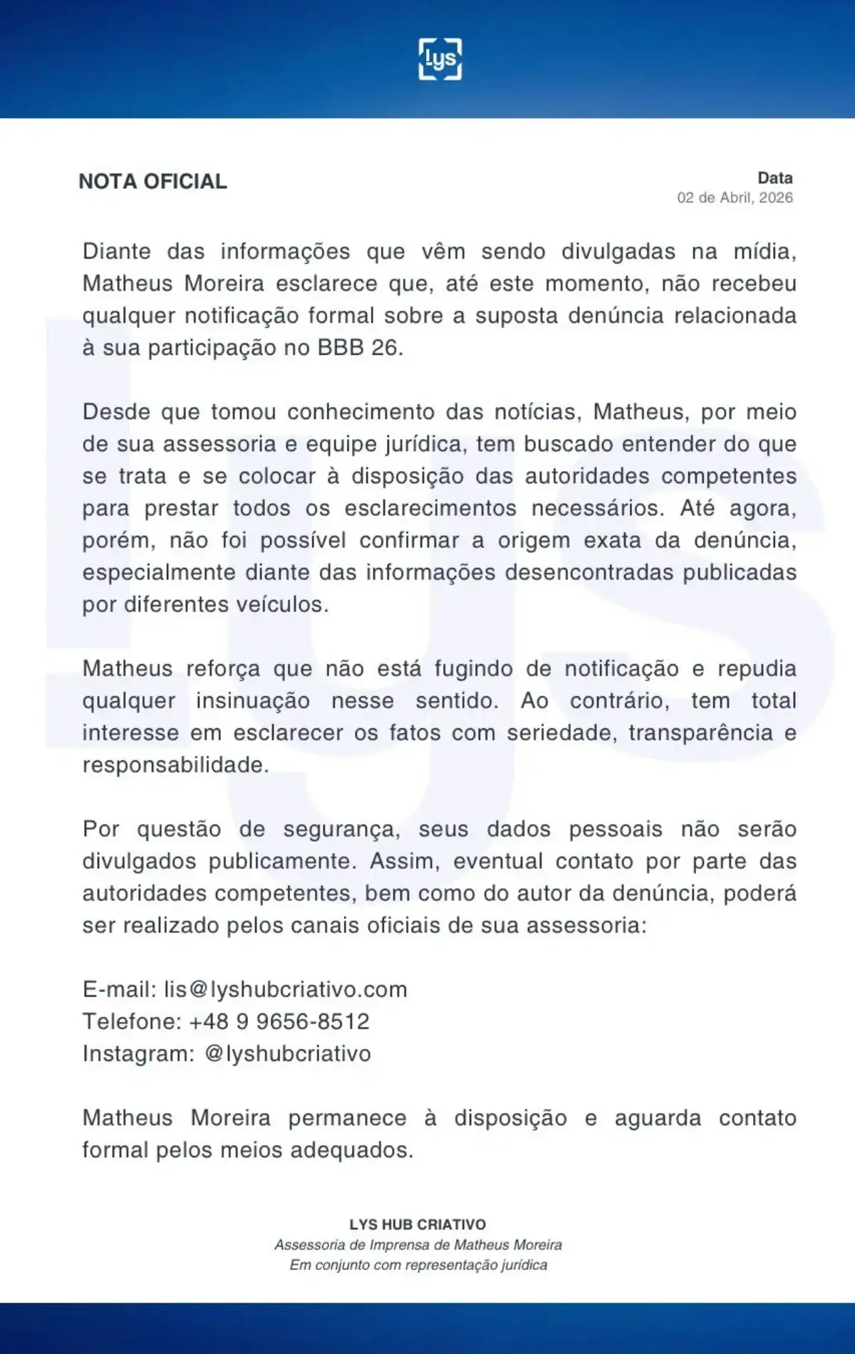 “Diante das informações que vêm sendo divulgadas na mídia, Matheus Moreira esclarece que, até este momento, não recebeu qualquer notificação formal sobre a suposta denúncia relacionada à sua participação no BBB 26.