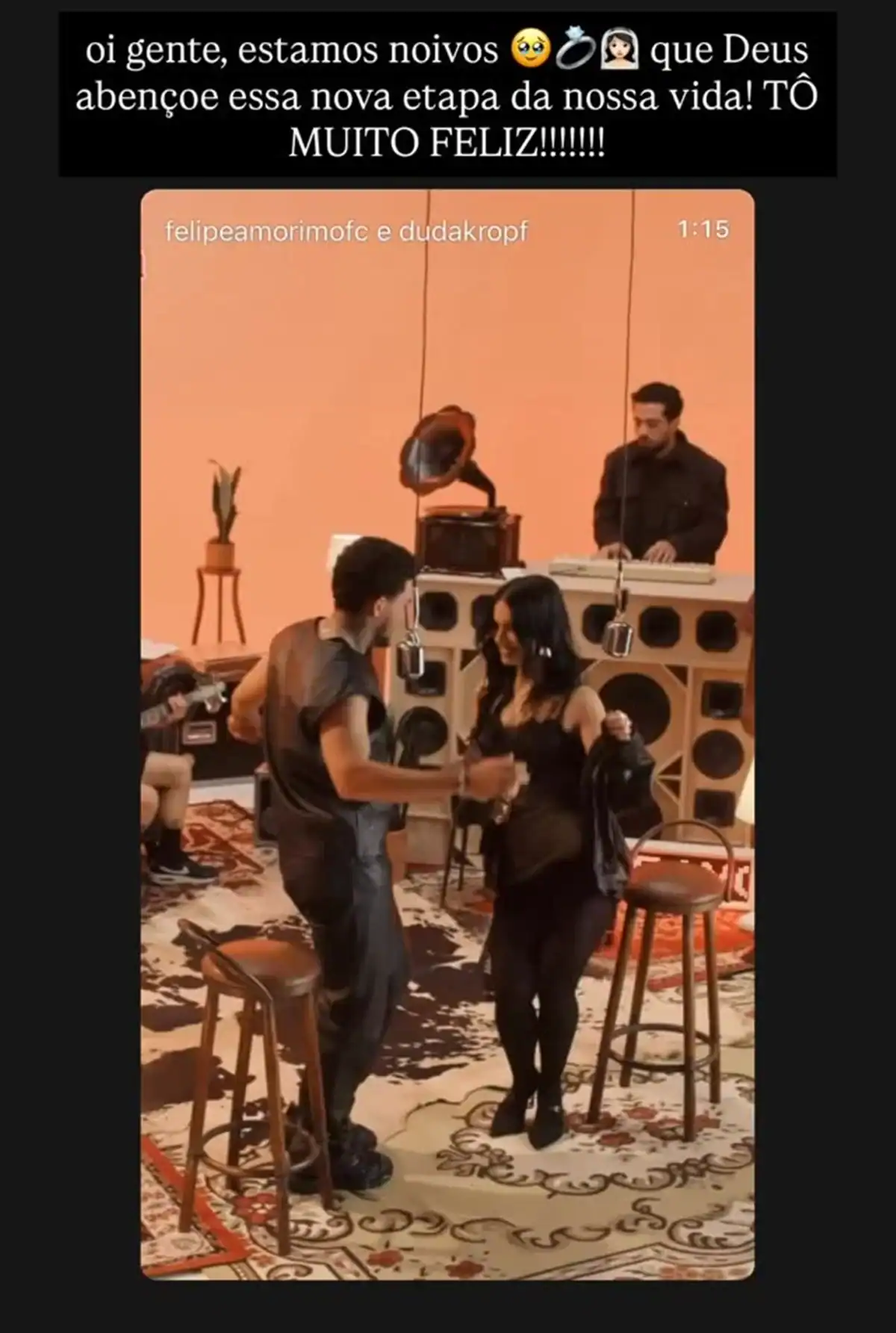Felipe Amorim e Duda Kropf estão noivos. O cantor decidiu surpreender a namorada no último dia 26, durante a gravação de um clipe, e compartilhou a reação dela no Instagram nesta quinta-feira (2/4).