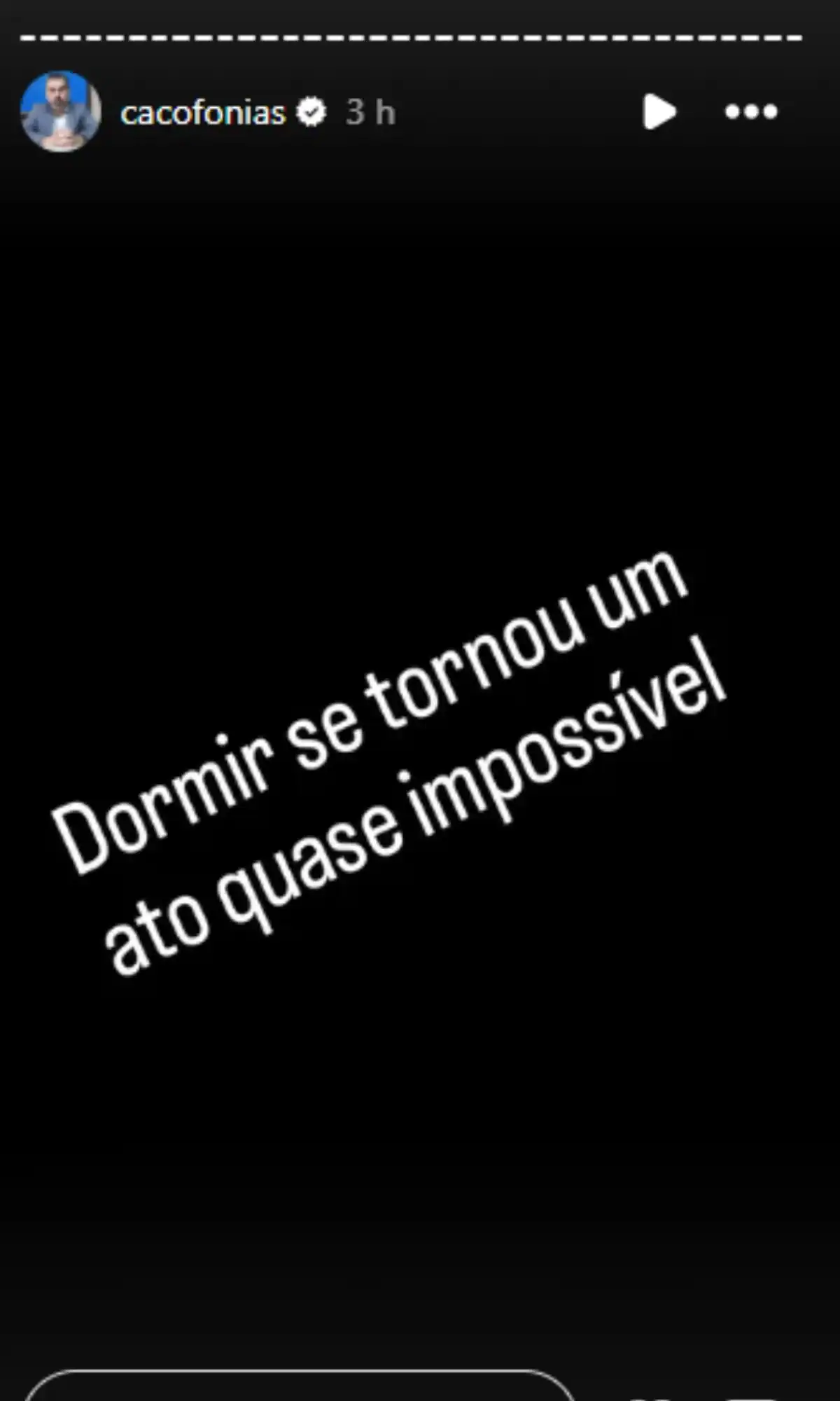 O humorista Vinicius Antunes, conhecido como Cacofonias, fez um desabafo nas redes sociais após o falecimento e sepultamento de seu filho, Francisco Farias Antunes, de 9 anos. O artista compartilhou com seus seguidores a dificuldade de conseguir dormir após os acontecimentos.